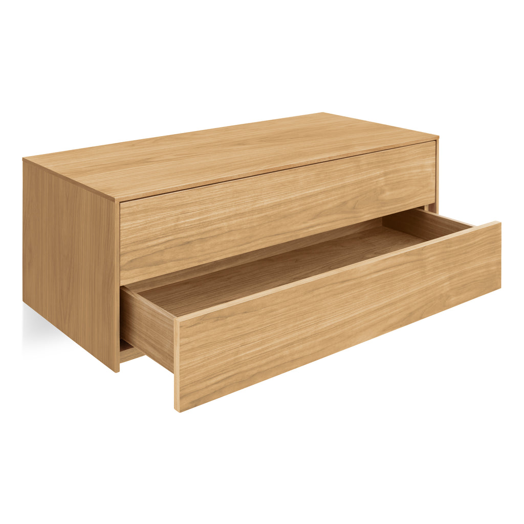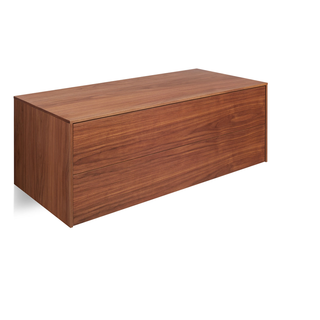 Wall-mounted two-drawer cabinet maximizes functional storage and provides a custom-looking solution without the hassle of finding someone to build it. In walnut or white oak with push latch drawers. Pair with companion door, desk and shelf units to create a full-on storage masterpiece.