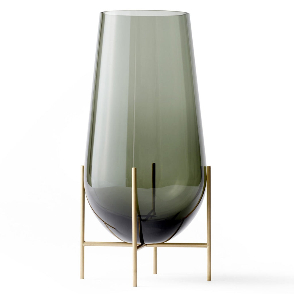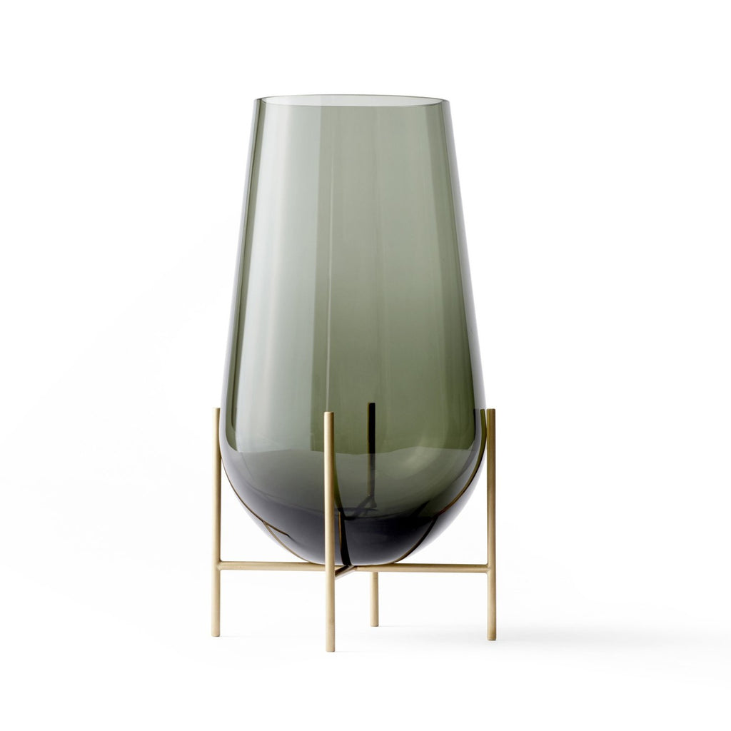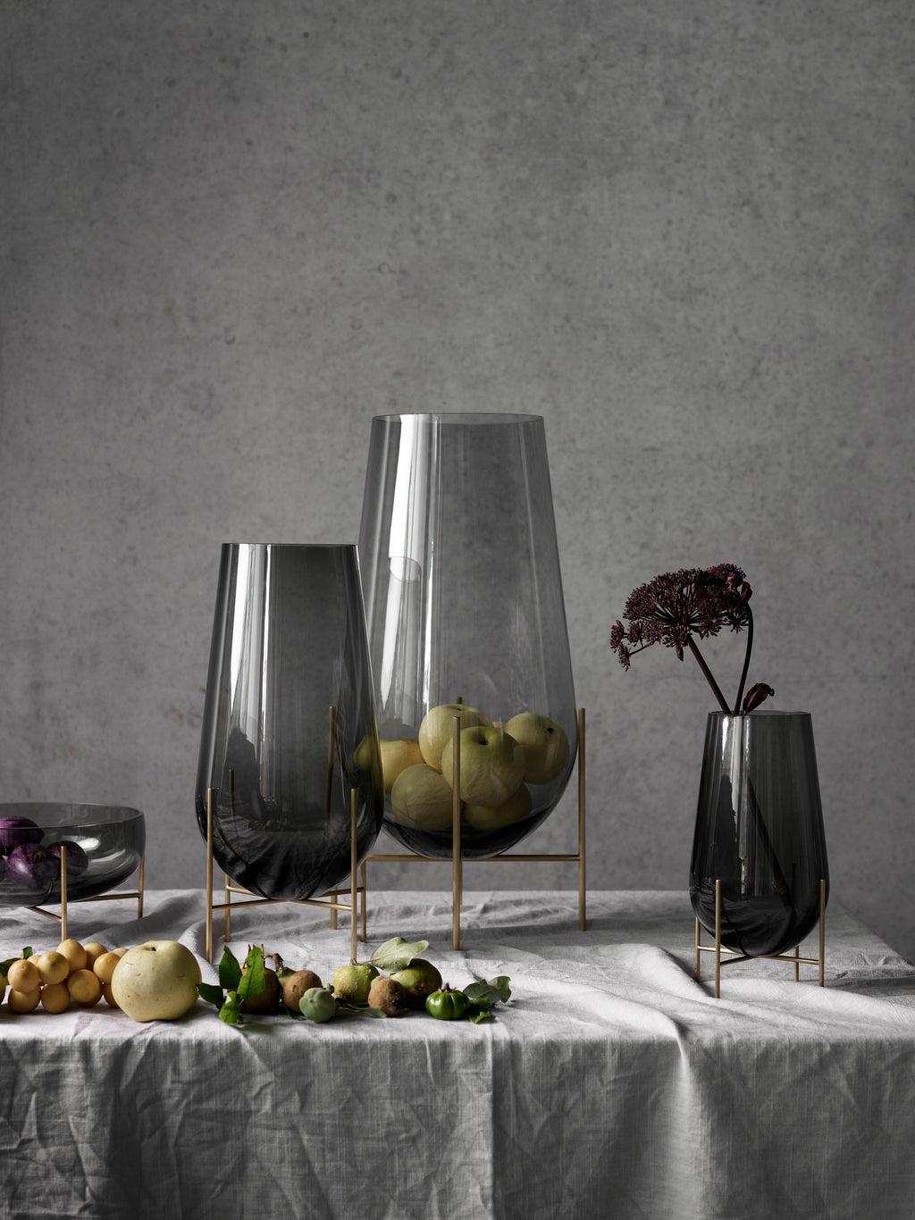 The Échasse Vase—The first piece in the now-iconic series was inspired by laboratory test tubes. The drop-shaped form is as elegant when holding flowers on a desk, living room floor, or nightstand as it is when left unfilled. The smoked glass version with brushed brass legs is available in three sizes. The unique colour gradients of the glass give the design depth and contrast against the legs’ clean lines. The smallest vase is now available with clear glass and bronzed brass legs; a classic pairing to complement any interior palette, in a size ideal for more compact spaces.