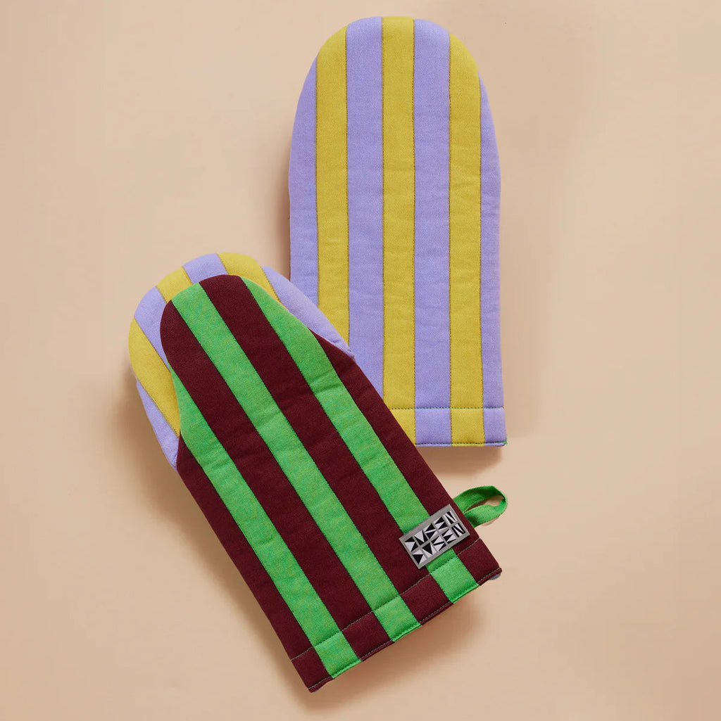 Resists temperatures up to 400 degrees Fahrenheit. Do not use mitts when wet. Padded oven mitt in contrasting stripe colorways. Features a "frog-style" mitt shape, top stitched brand label, and a side loop. 100% cotton quilted canvas base, with polyester fill. Made in India.