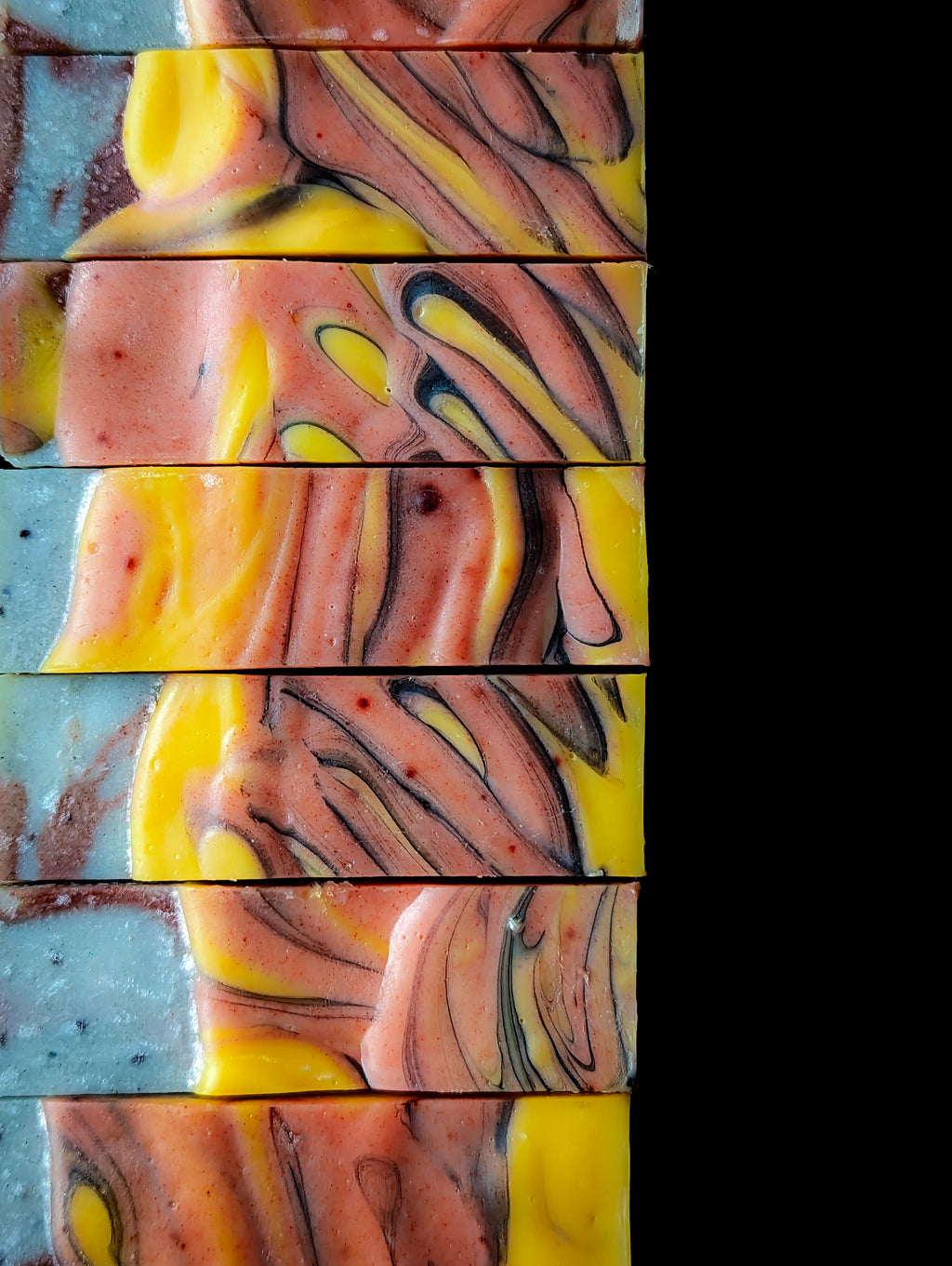 Caprae lac, Sodium Olivate, Sodium Grapeseedate, Sodium Cocoate, Sodium Shea Butterate, Sodium Castorate, Cera Alba, Sodium lactate, Indigofera Tinctoria (Indigo) Leaf Powder, Bixa orellana (Annatto) seed extract, Vaccinium Macrocarpon (Cranberry) Seeds, Carbo Activatus, Rubia tinctorum root, Alkanna Tinctoria (Alkanet) Root Extract, Illite/Kaolin, Citrus Nobilis (Clementine) Peel Oil , Citrus Aurantifolia (Lime) Oil , Citrus Paradisi (Grapefruit) Peel Oil, Citrus Bergamia (Bergamot) Peel Oil, Ocimum Basilicum (Basil) Oil, Citrus Limonum (Lemon) Peel Oil