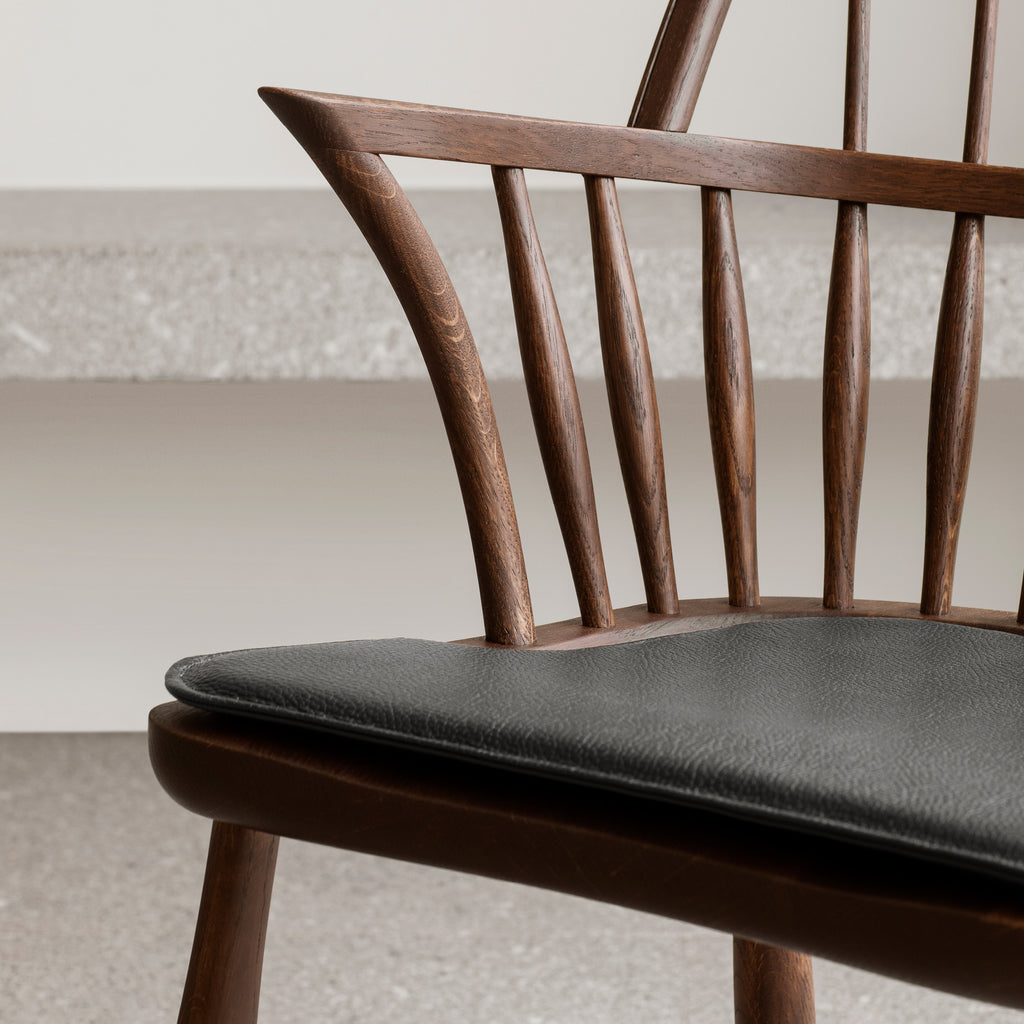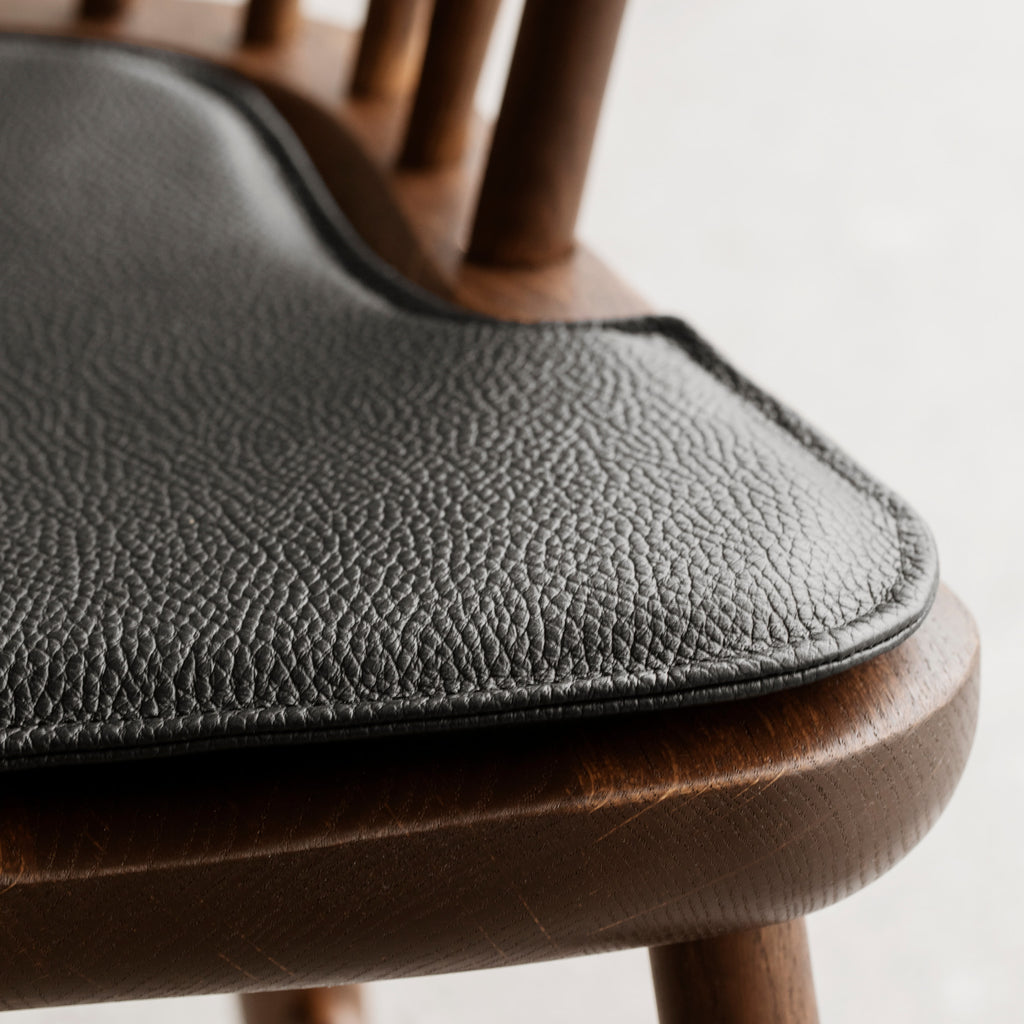 The Windsor Chair is available in oak oil, oak soap, and oak smoked oil. Three custom seat cushions in leather are also available for additional comfort.