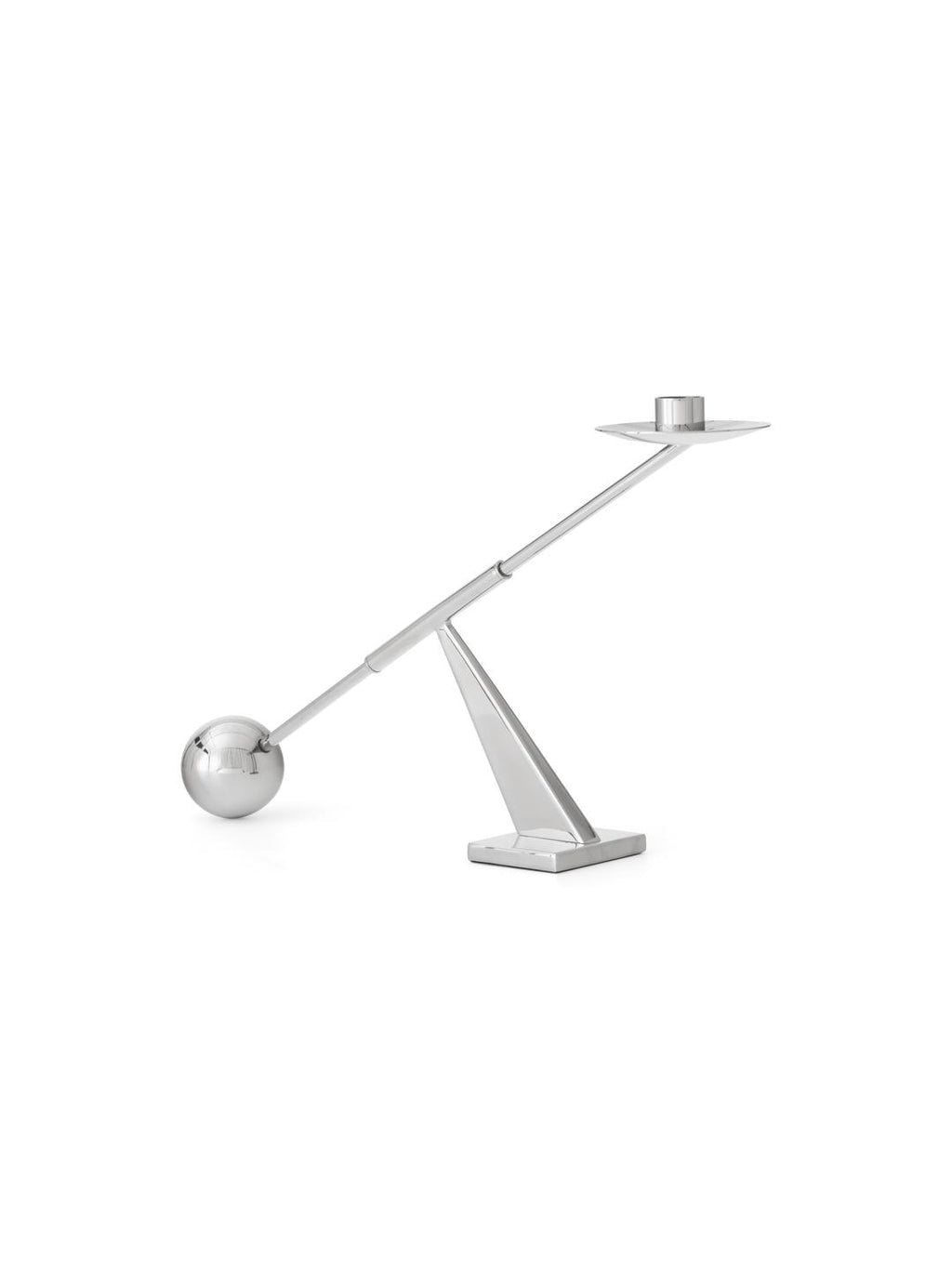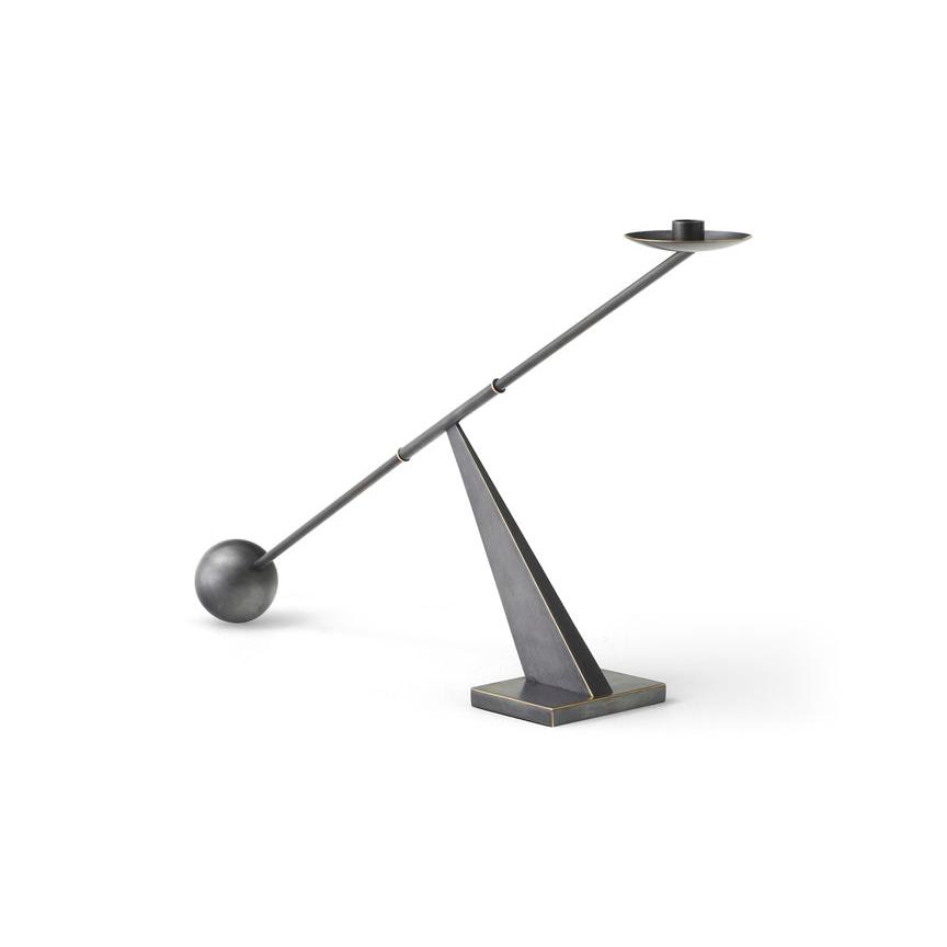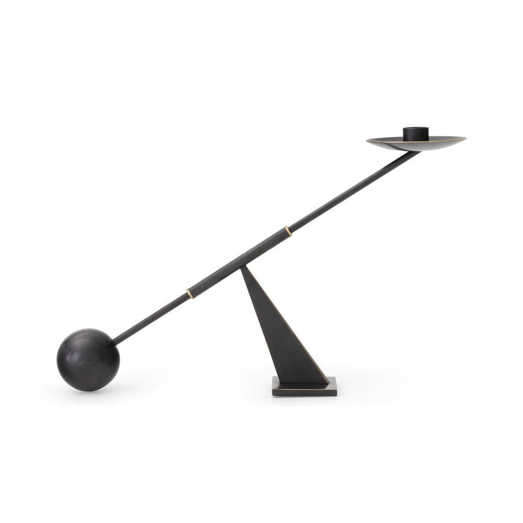 Interconnect Candle Holder is a bold and illuminating centrepiece of exaggerated proportions, designed for Audo by Colin King. As a source of cozy candlelight, it is characterized by its deceptively simple geometric form: a sphere, an angle and a line, which unite to create a unique design. Available in polished brass or painted steel, it goes beyond its intended use to function as a sculpture.