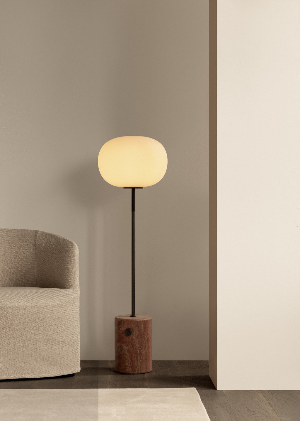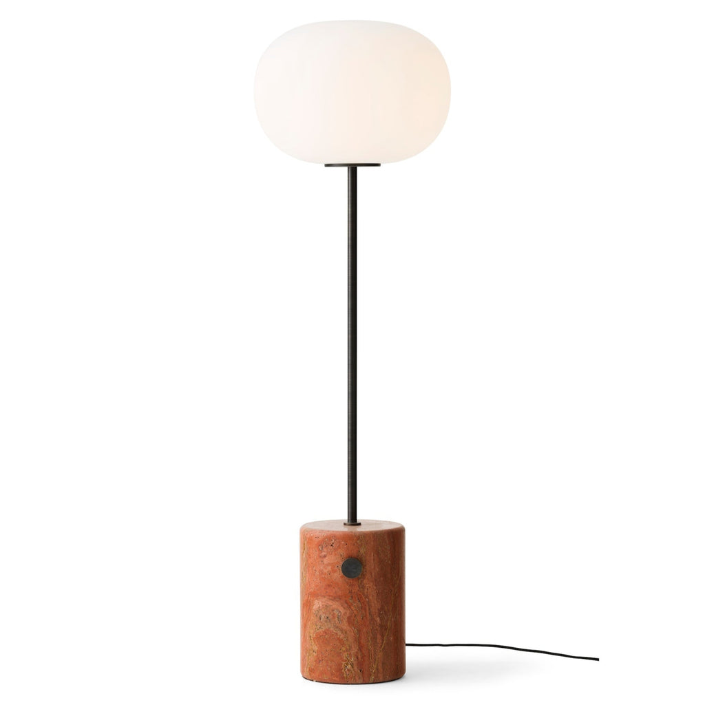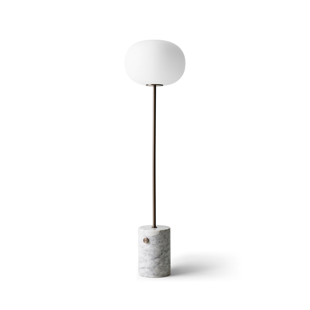 Part of a collection of lighting inspired by traditional oil lamps, the JWDA Floor Lamp takes the expression of the collection’s table lamp to elegant new heights. Pared back to its purest form, the lamp is a study in the contrasts of natural materials: set on a substantial marble base, rounded at the edges for a soft expression, the elegant tubular metal stem – available in brushed or bronzed solid brass – holds an elliptical opal glass shade that emits a soft, ambient light.