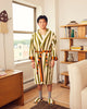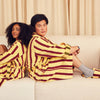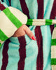 Cotton terry bathrobe with shawl collar, patch pockets, and tie. Contrasting stripes and colourways on both sides. 95% cotton terry, 5% polyamide, 430 GSM. This item is Oeko-Tex Standard 100 certified (no harmful chemicals were used during production). Made in Portugal.