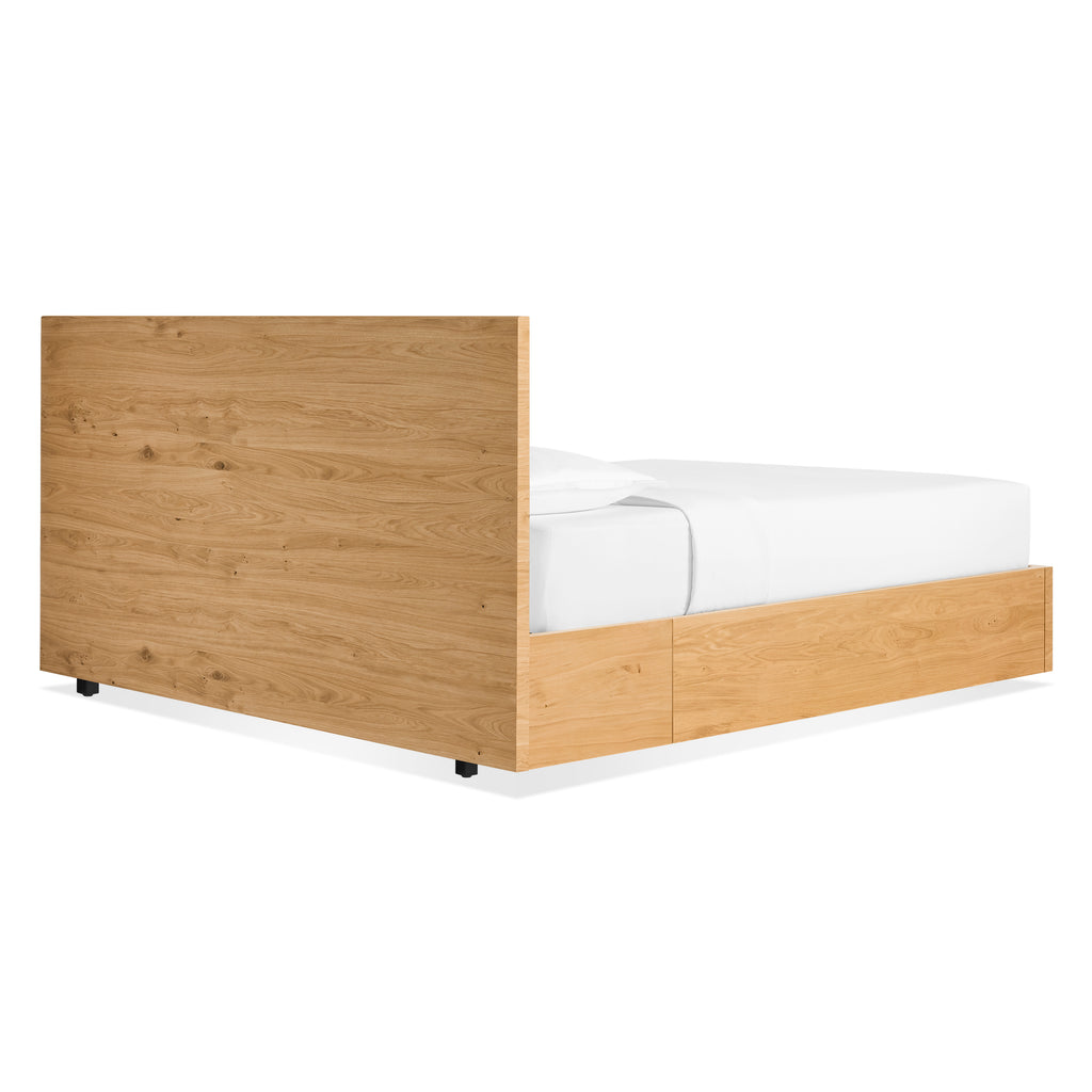 We used the top and bottom edges of the drawer faces as pulls, so we could eliminate handles or knobs. By joining two drawer boxes with one drawer face and hiding the side rails behind, we minimized the shadow lines of the drawer reveals. We also positioned the drawers to accommodate a nightstand. We hid the feet to keep the wood surfaces clean and simple.