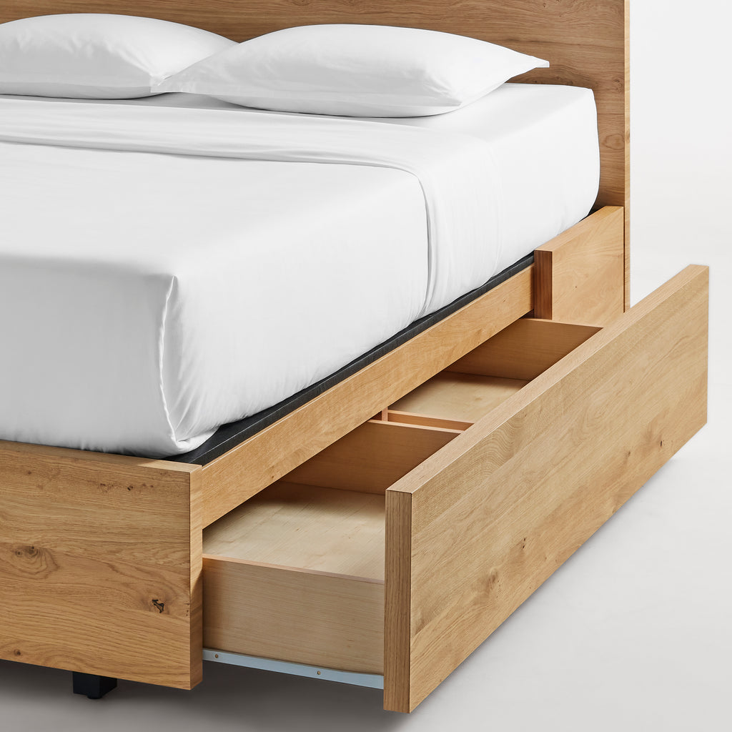 Where we wanted to draw attention, we placed carefully selected wood veneers over thick, robust panels. The clean design, with its warm wood and luxe leather, serves as the perfect backdrop for your bedding while providing inconspicuous storage.