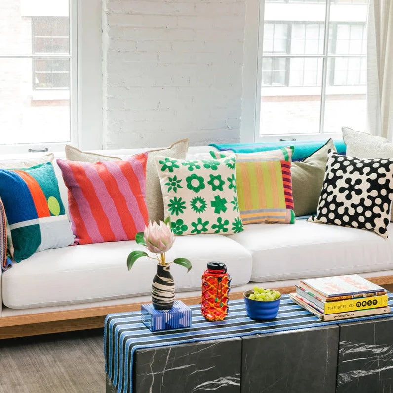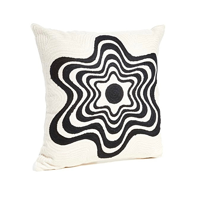 Embroidered pillow in black and white flower pattern. 100% cotton, back zip, canvas back. Made in India. Spot clean only.