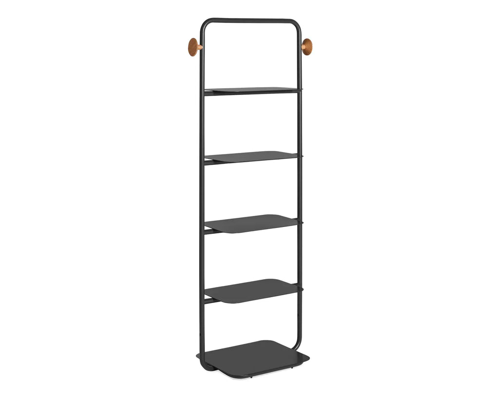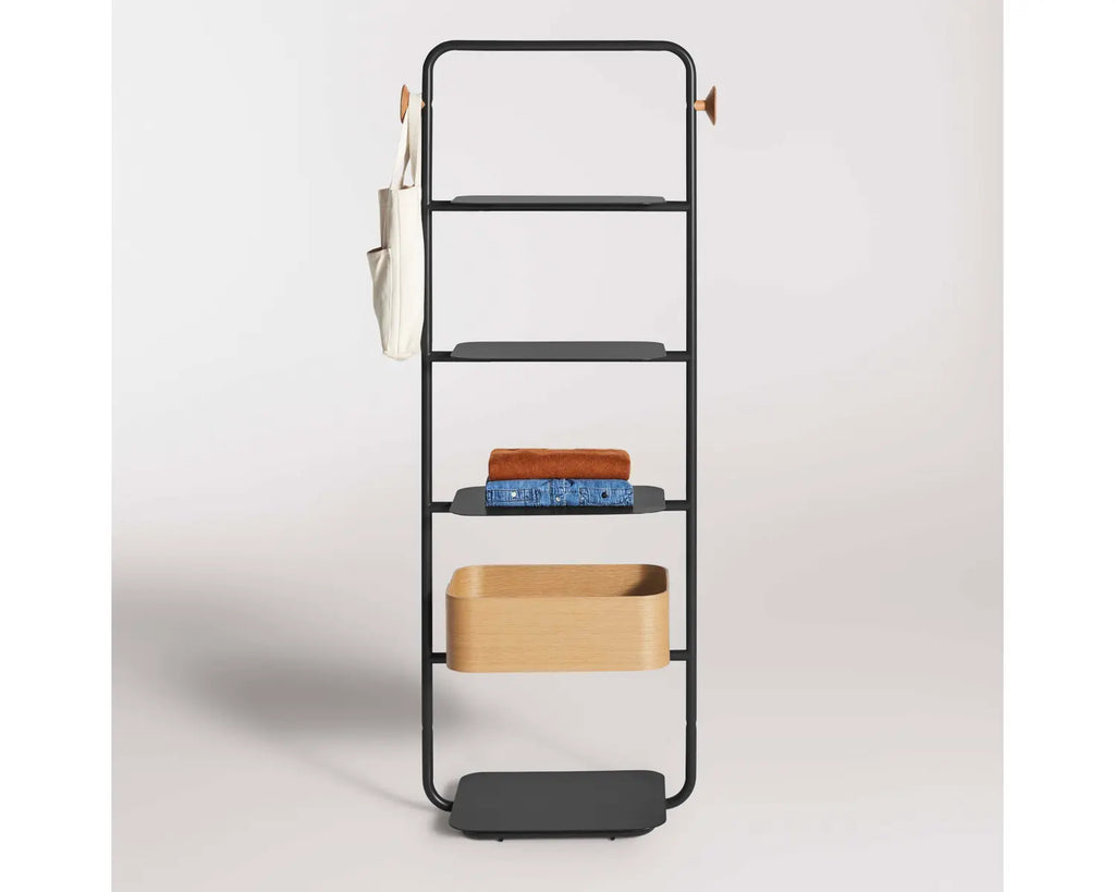 Show your clothes a good time. Garden Party is the perfect storage for people who have no storage. Durable powder-coated steel shelves create a clean and quiet spot to stage outfits or showoff your full regalia. Solid white oak knobs provide an extra spot to hang accessories. Pair with Garden Party Garment Rack and Storage Box for the closet of your dreams.