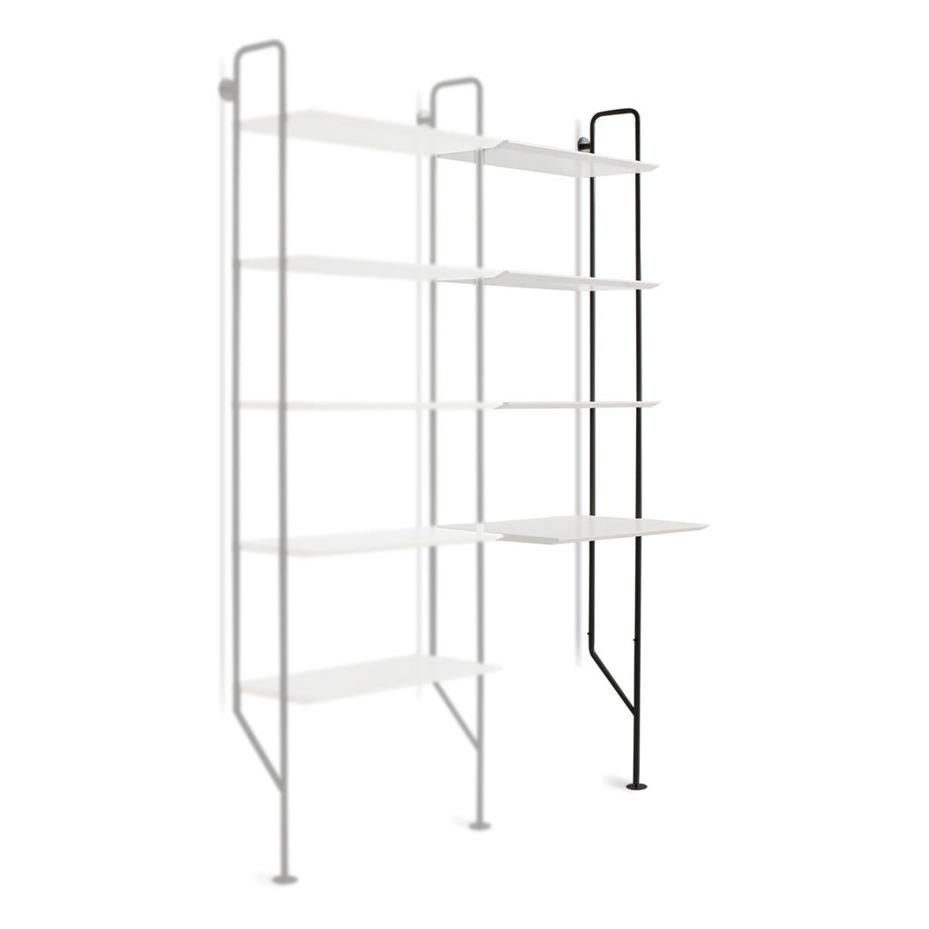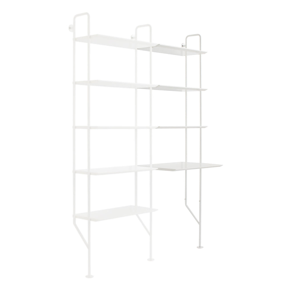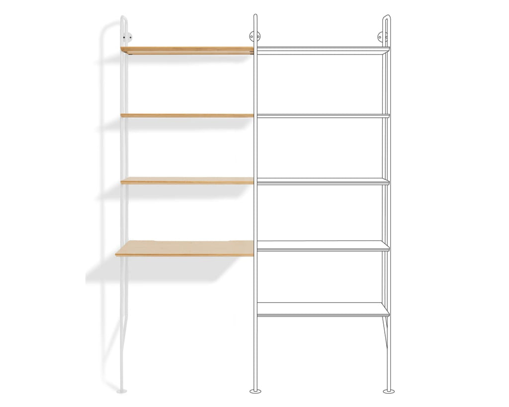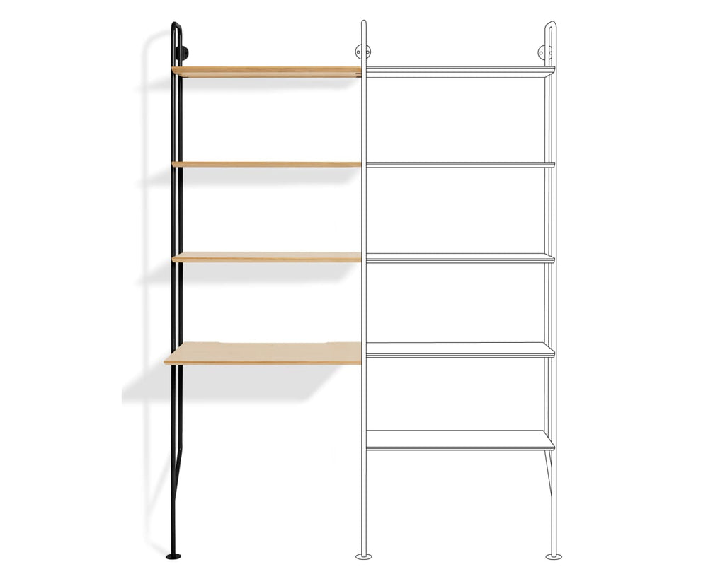 Powder coated steel uprights and wood shelves in multiple finish options make you the master of your own book case destiny. We added a desk with the perfect work surface for even more choices. Single units stand alone. Gang up multiples to create mass appeal.