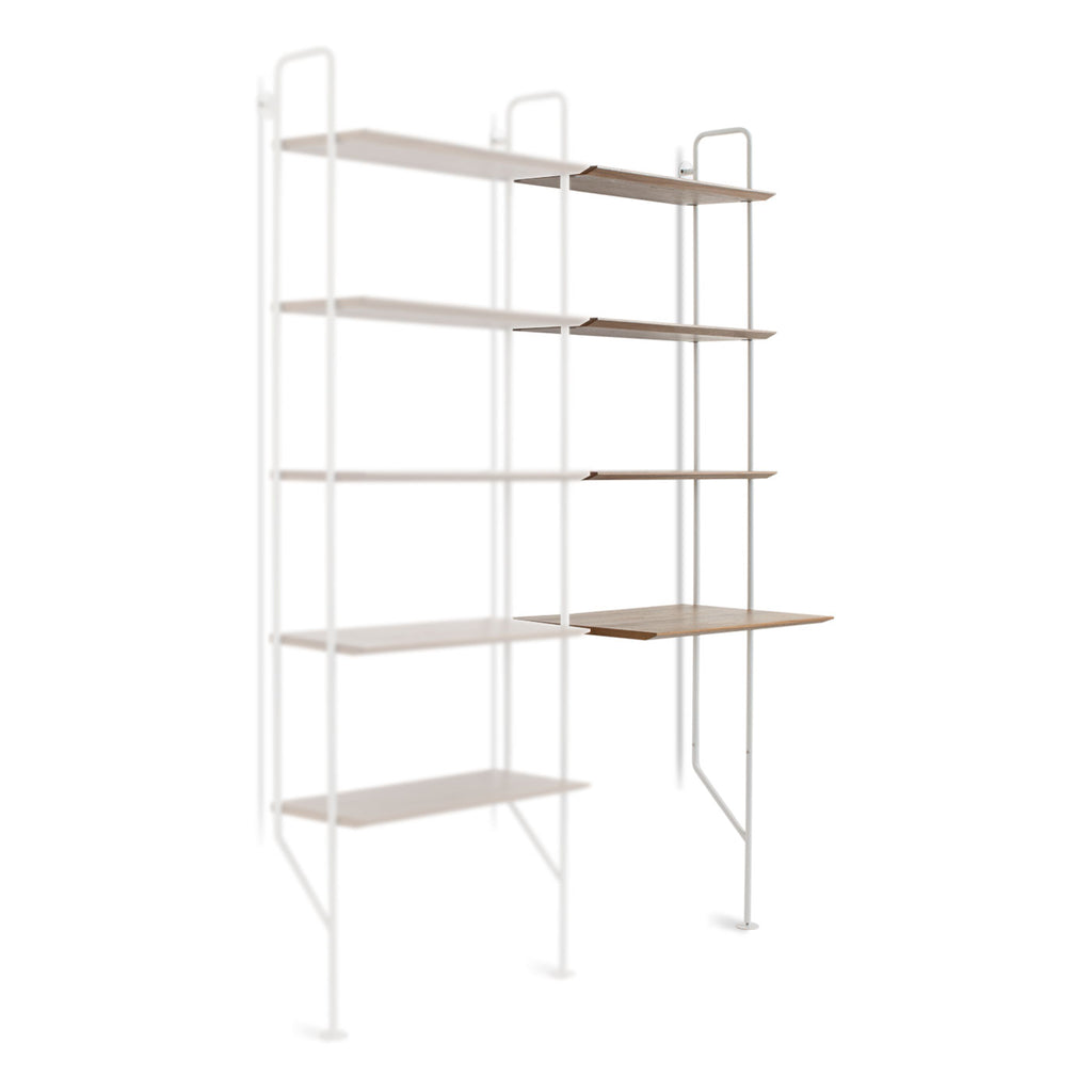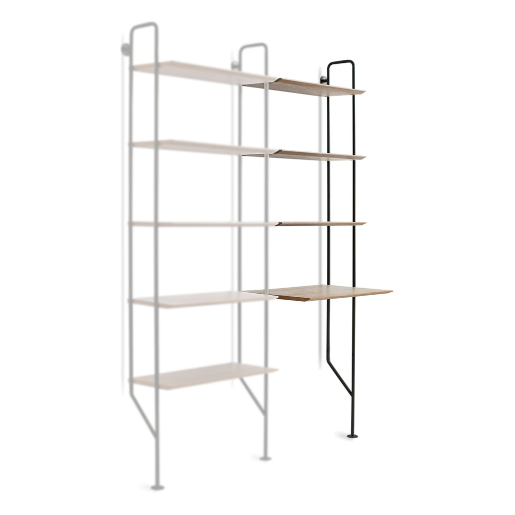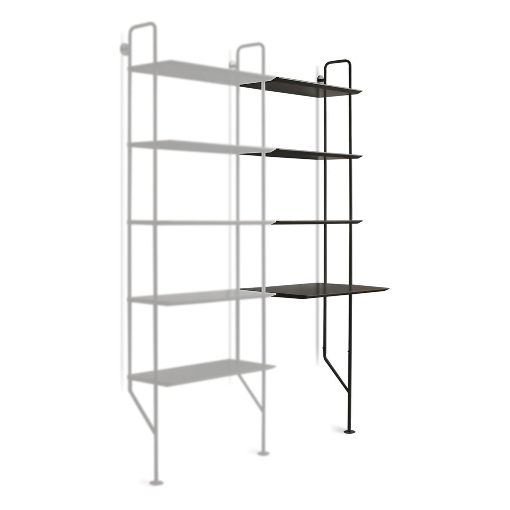 Powder coated steel uprights and wood shelves in multiple finish options make you the master of your own book case destiny. We added a desk with the perfect work surface for even more choices. Single units stand alone. Gang up multiples to create mass appeal.