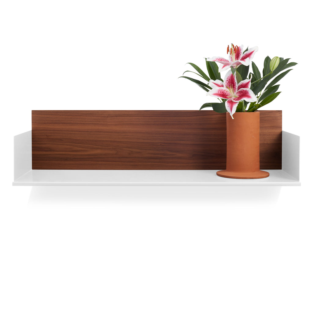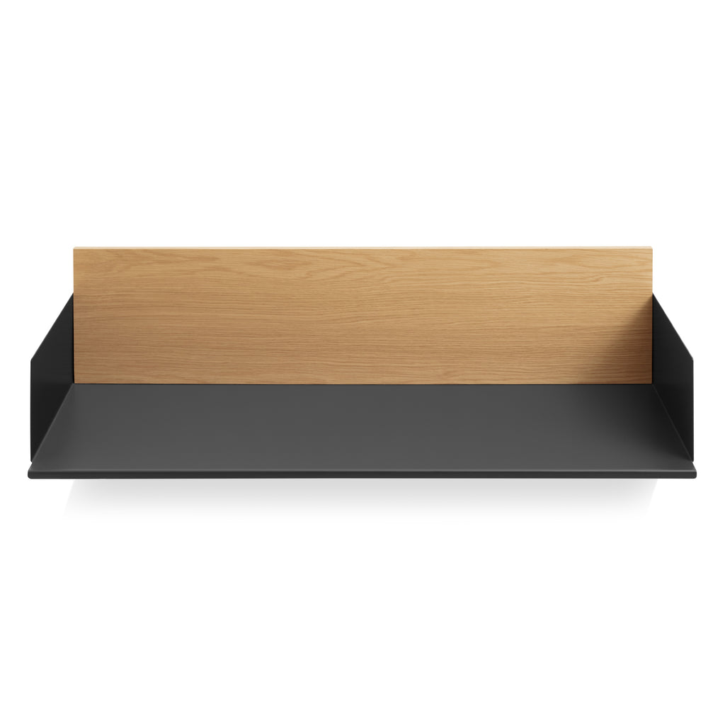 Wall-mounted powder-coated steel shelf with a walnut or white oak back panel turns any wall into an opportunity. Pair with companion cabinet and desk units to create a full-on storage masterpiece.