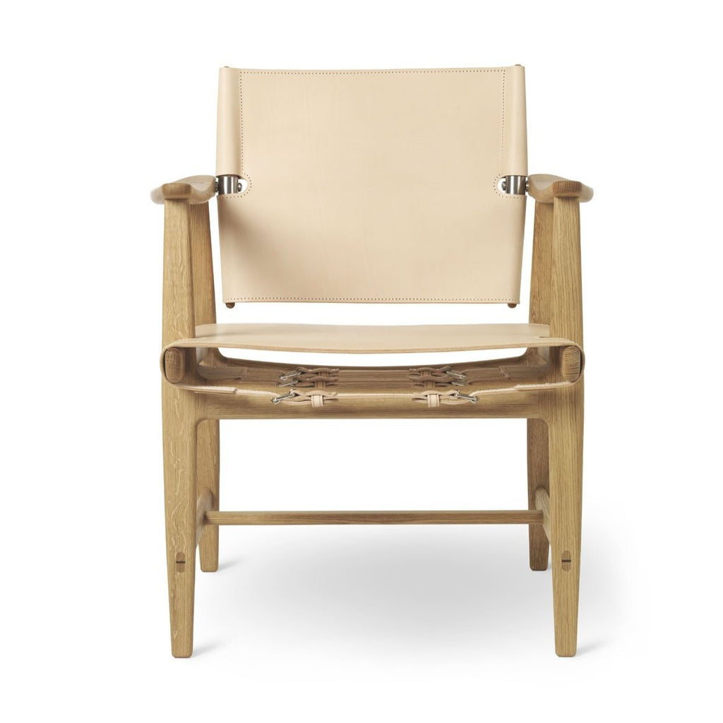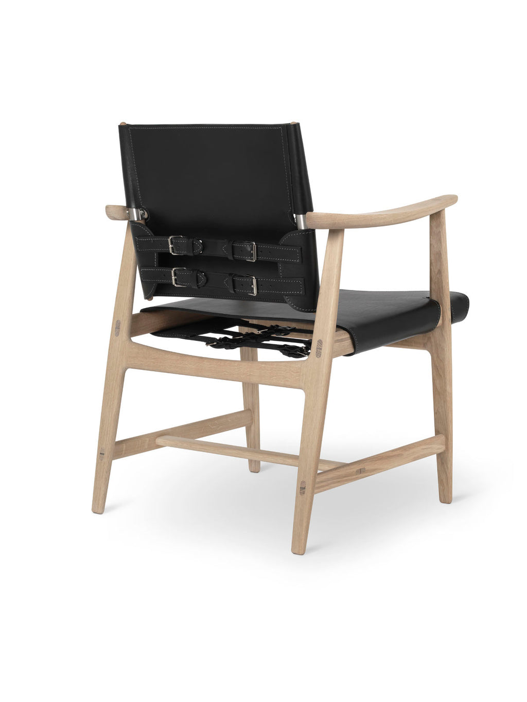 The chair unites two distinct design expressions: simplicity and complexity, resulting in a chaste design with unique details. Presenting a rugged elegance, the stringent design allows the natural and high-quality materials to speak for themselves: The luxurious saddle leather is held taut by buckles and brackets in steel or brass and contrasted by a solid wood frame. The design makes for a flexible and comfortable chair that allows for a variety of sitting positions.