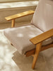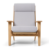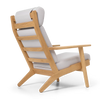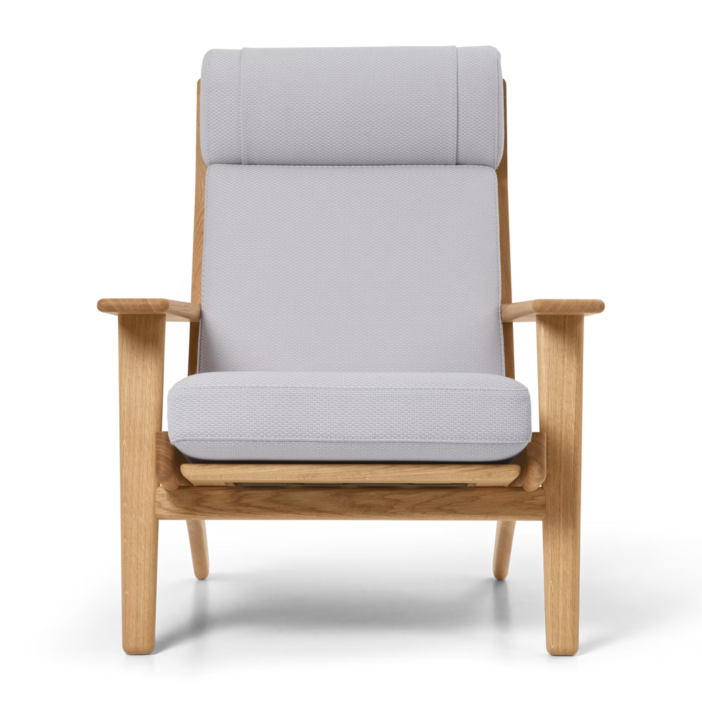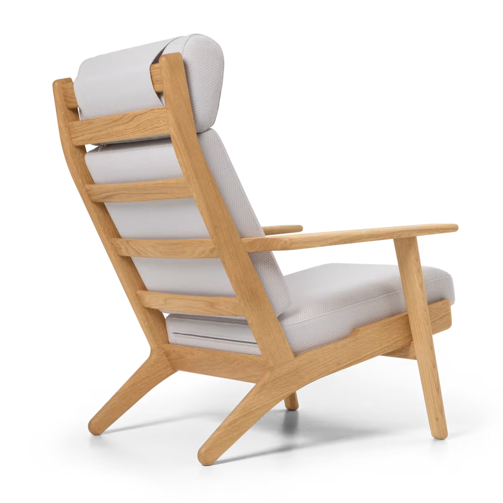 The CH291 Lounge Chair was designed in 1962, showcasing classic Hans J. Wegner hallmarks in a stringent FSC™-certified solid oak frame and contrasting, relaxed upholstery. Part of the CH290 Series, the chair demonstrates precise craftsmanship and supreme comfort in a supportive, tall backrest and neck pillow. Dynamically angled legs, wide armrests and visible back slats are accentuated by an elegant, carefully upholstered seat and backrest cushion in fabric or leather.