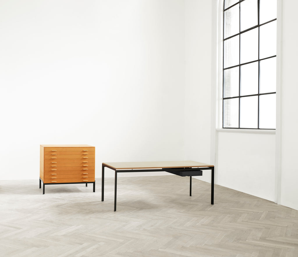 Poul Kjærholm designed the PK52 Professor Desk when the Academy needed a number of tables for lecturers and students. Drawing on his cabinetmaking experience, Kjærholm developed a new table structure that showcased his mastery of steel and wood. Metal ferrules separate the steel and wood to lend this desk a dynamic, light look. Furthermore, the tabletop is reversible, allowing the user to work on both sides – or use one side for work and the other for meals or entertaining.