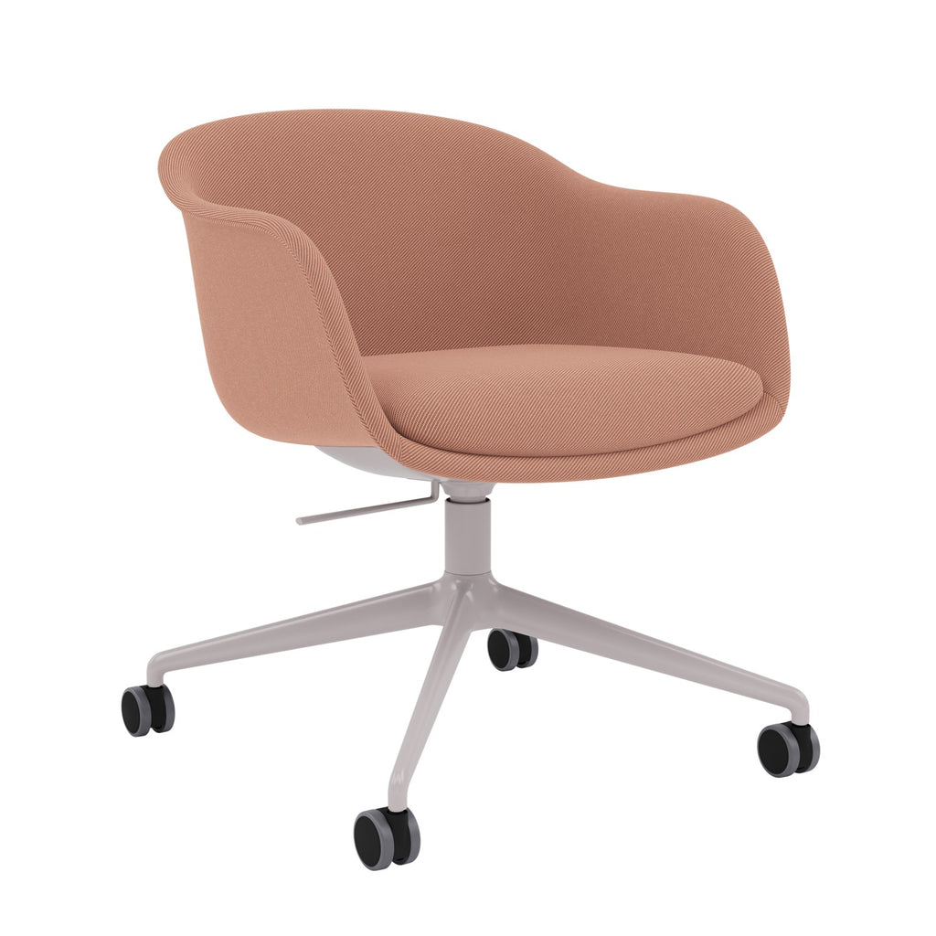Shell is made from 99 % recycled plastic and 1% strength-improving virgin plastic additives. The recycled plastic comes from post-consumer waste. Fully upholstered in textile or leather. Base in die-casted aluminum. Swivel base with castors in powder-coated or polished aluminum. Plastic Glides.