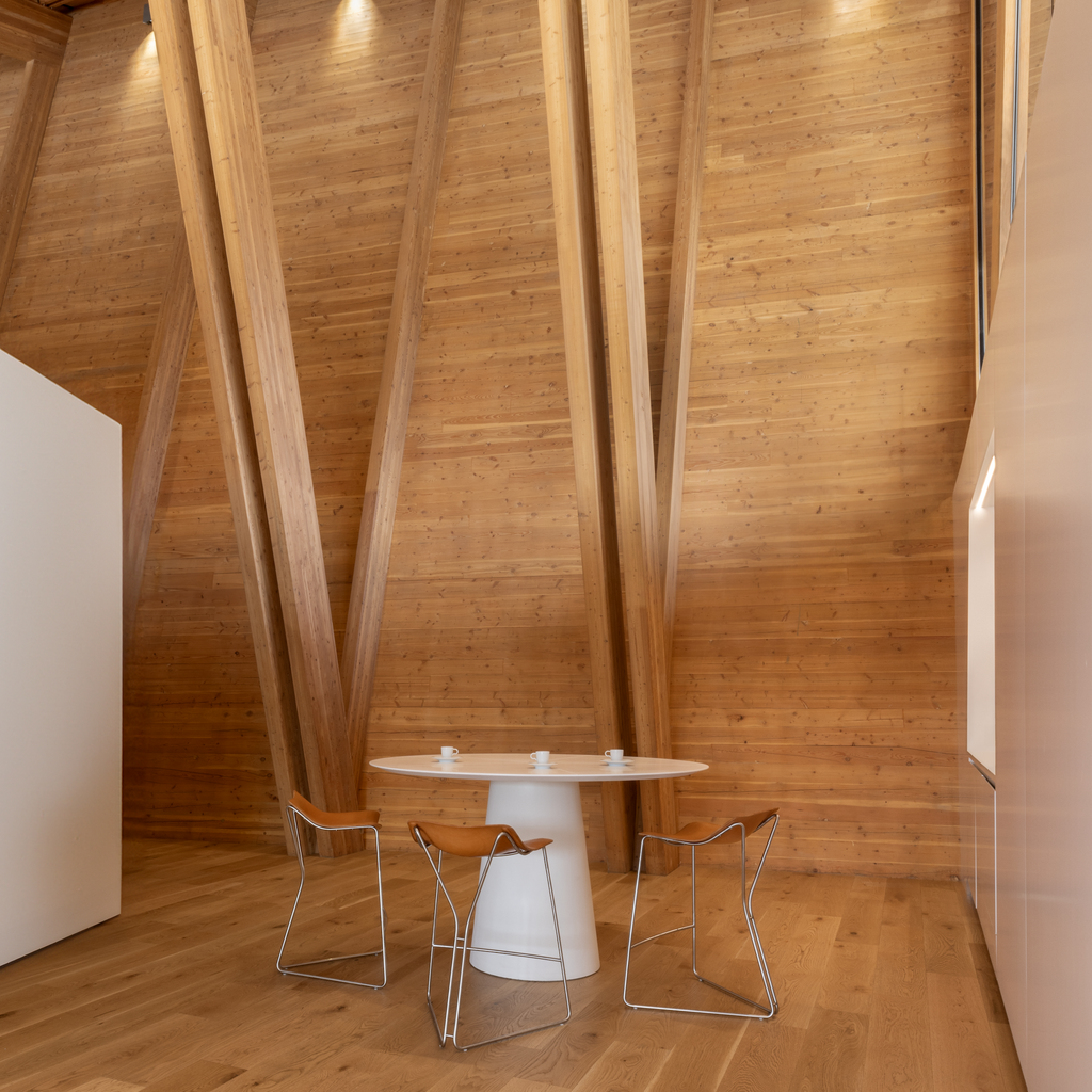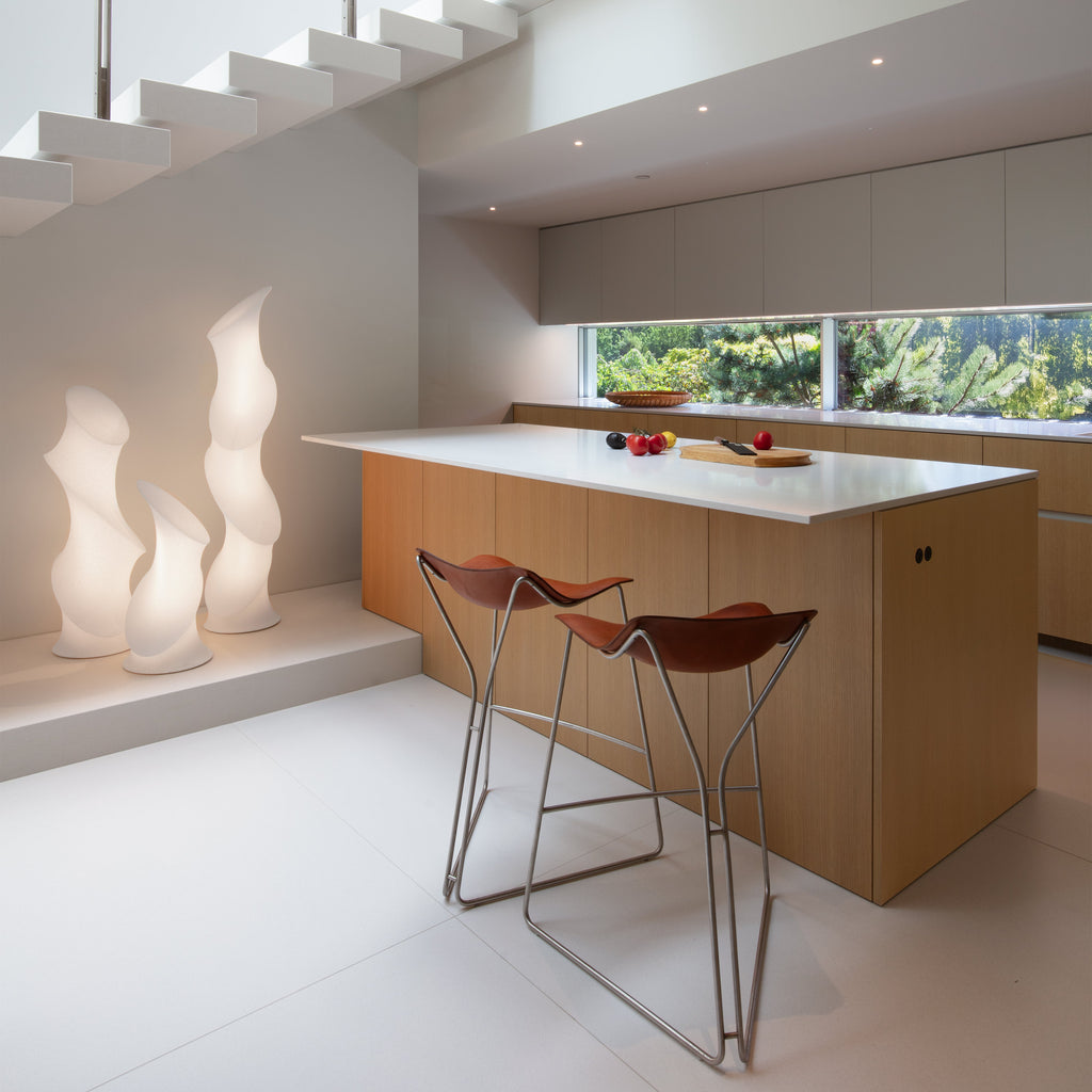A molded leather seat forms a supple saddle suspended within a limber stainless-steel frame. The Joey Stool is available in leather of various colours, made to order at Patkau's Design Lab in Vancouver.