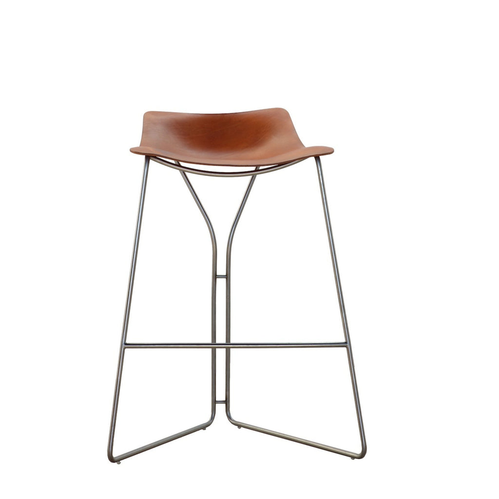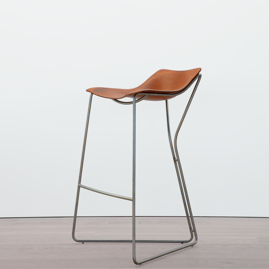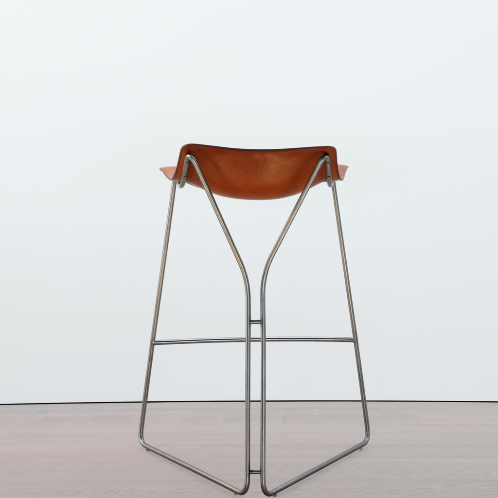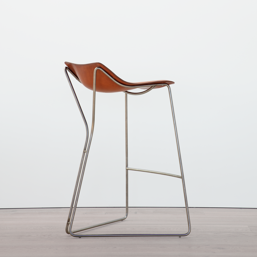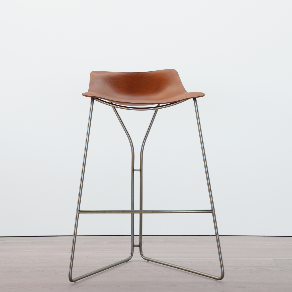 Joey is a light-weight stool designed for contemporary spaces. It is composed of a formed leather shell and a tubular stainless-steel frame consisting of two closed profiles that meet at the back and branch to a Y. The Y shape acts as a spring, dampening impact and improving the comfort of the shell by providing it greater flexibility.