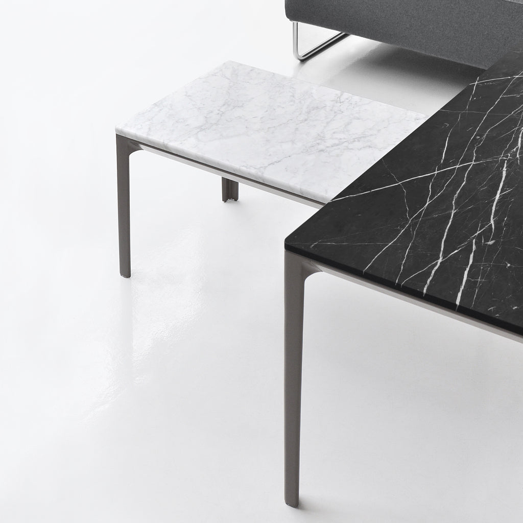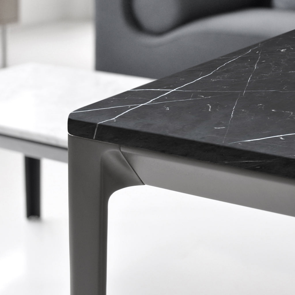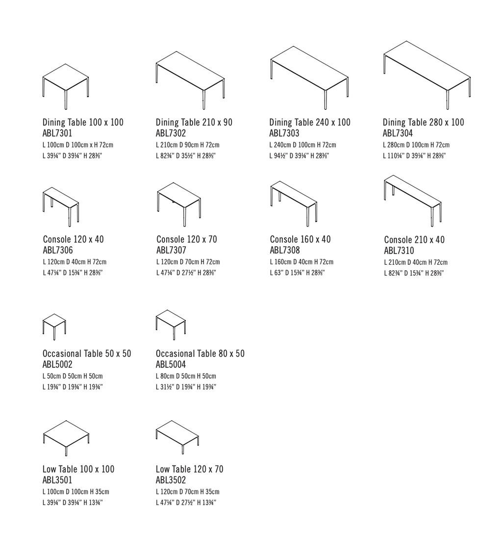 The tables offer a variety of solutions in size, and materials by using cast aluminium legs and aluminium rails to support tops in wood, marble and Polaris. The versatility takes the Ables anywhere in the home - dining, living, bedrooms, and eventually outdoors..