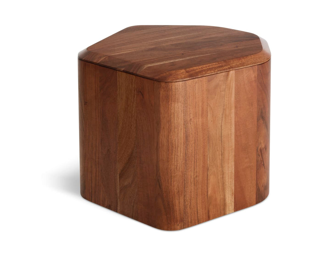 Nothing to see here. Solid Acacia wood forms an organic table surface and a clandestine storage space for blankets, toys and minor messes. Removable beveled top provides extra polish and panache. Sufficiently lovely on its own, or nest with a mix of sizes for an elegant coffee table cluster.