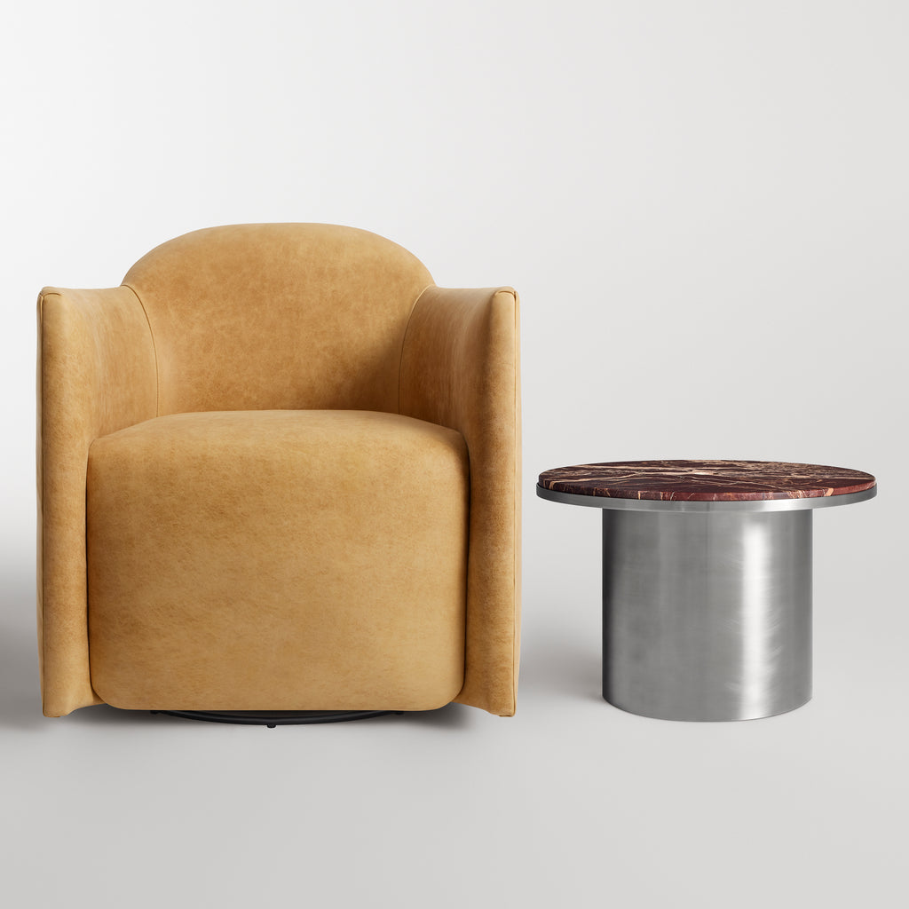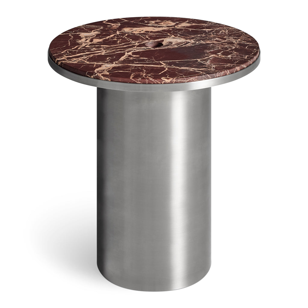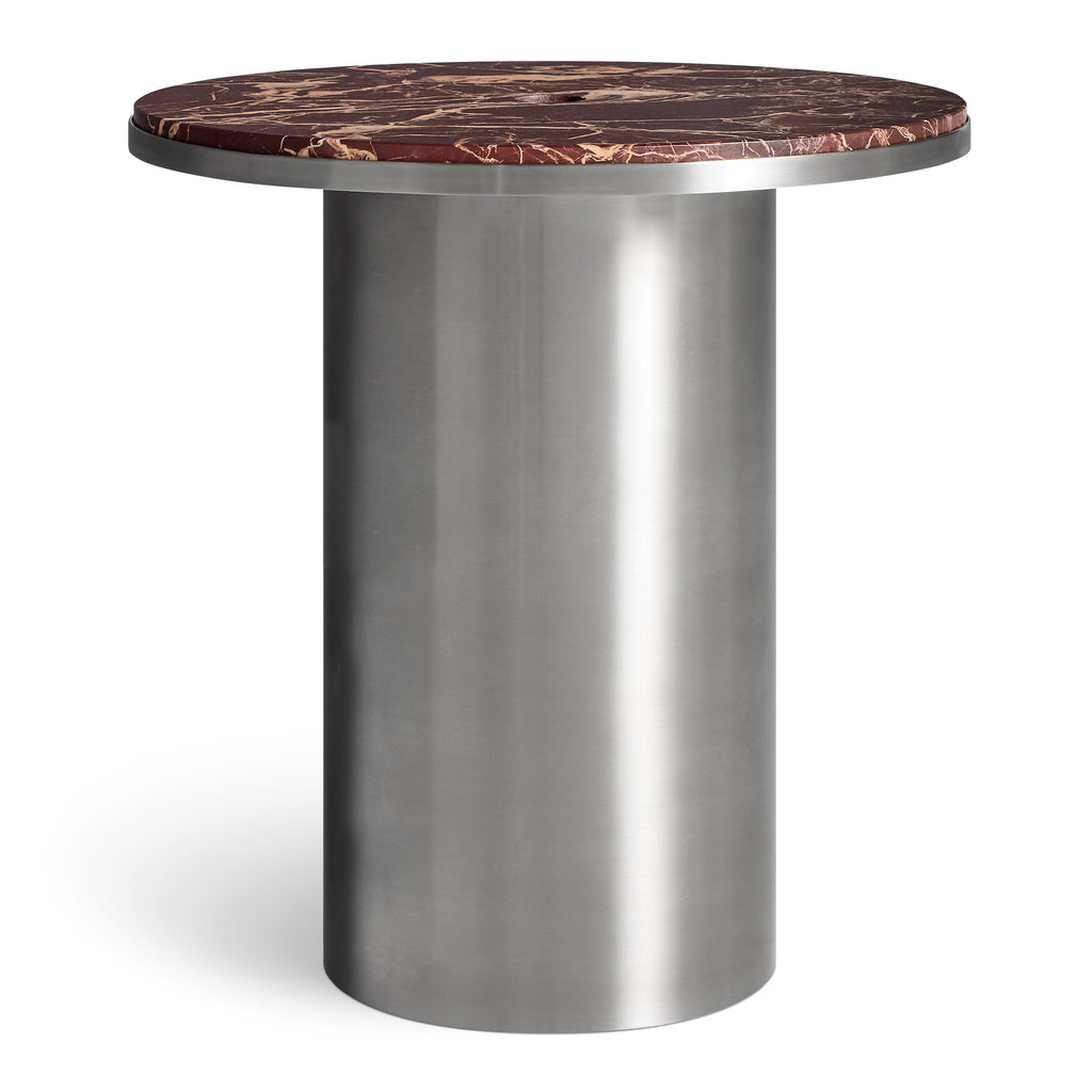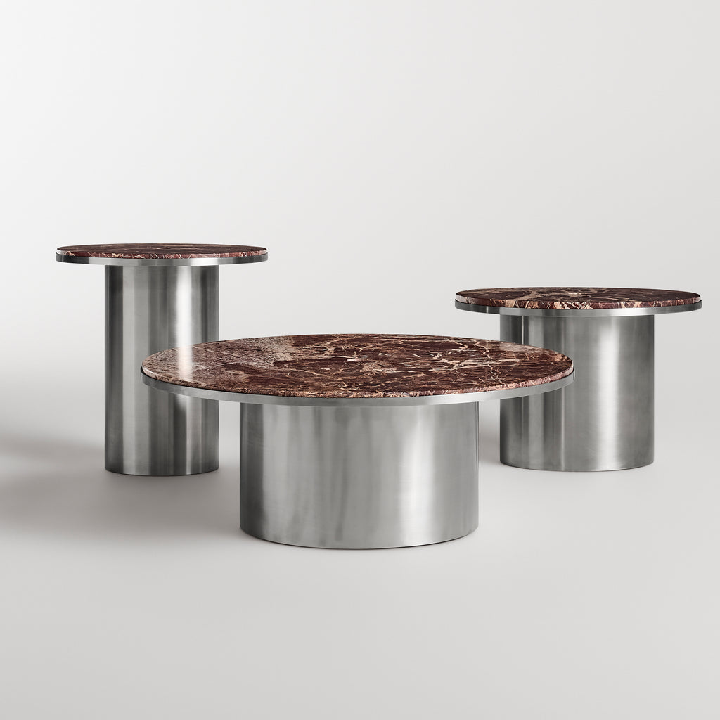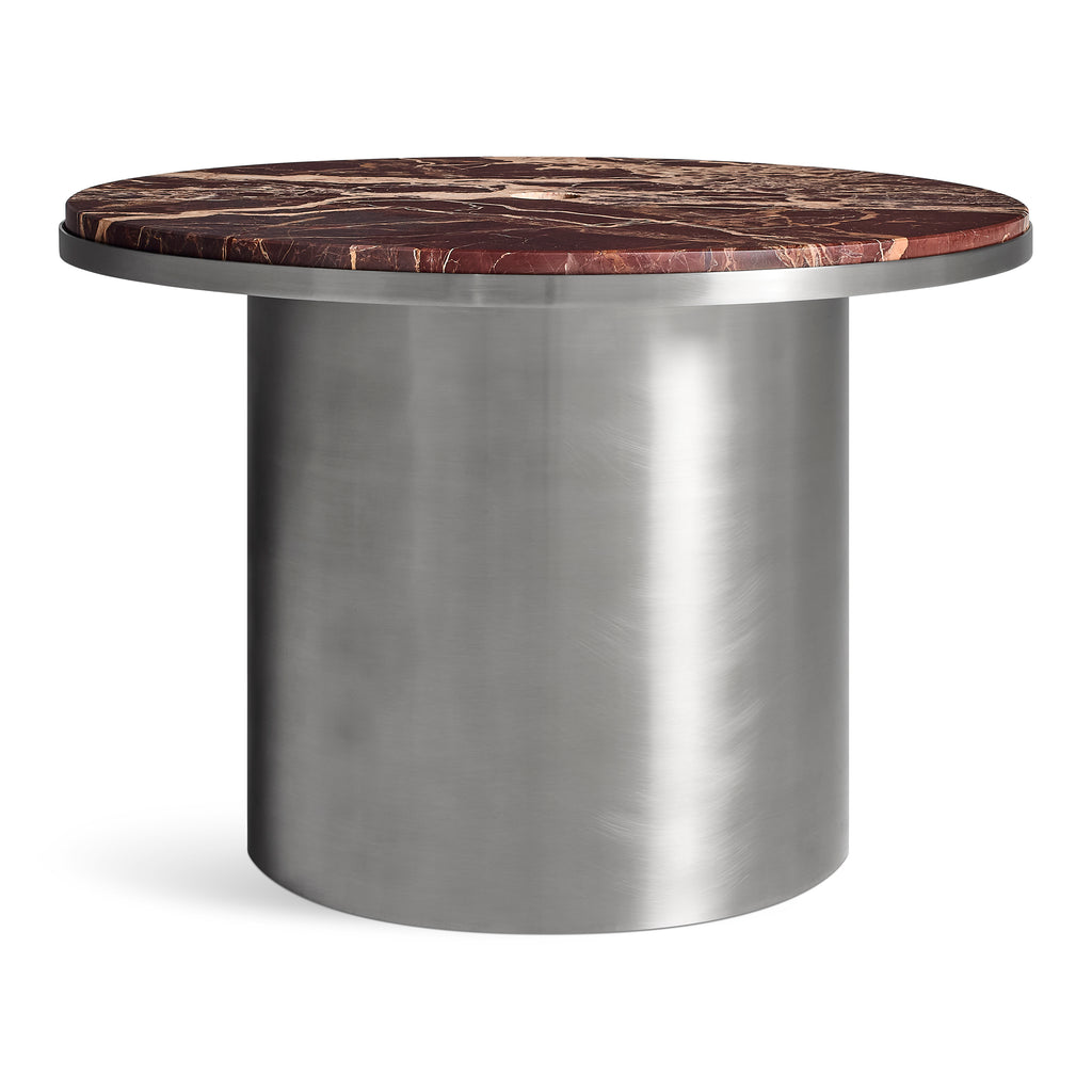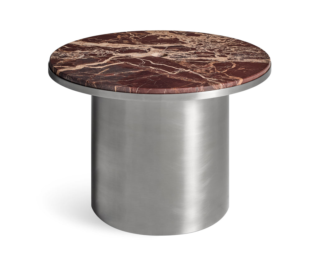 A polished wheel of Cherry marble sits on a tidy steel base for an effect that is loaded with low key elegance. Great on their own, but pair nicely together.