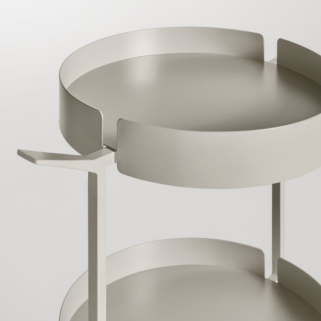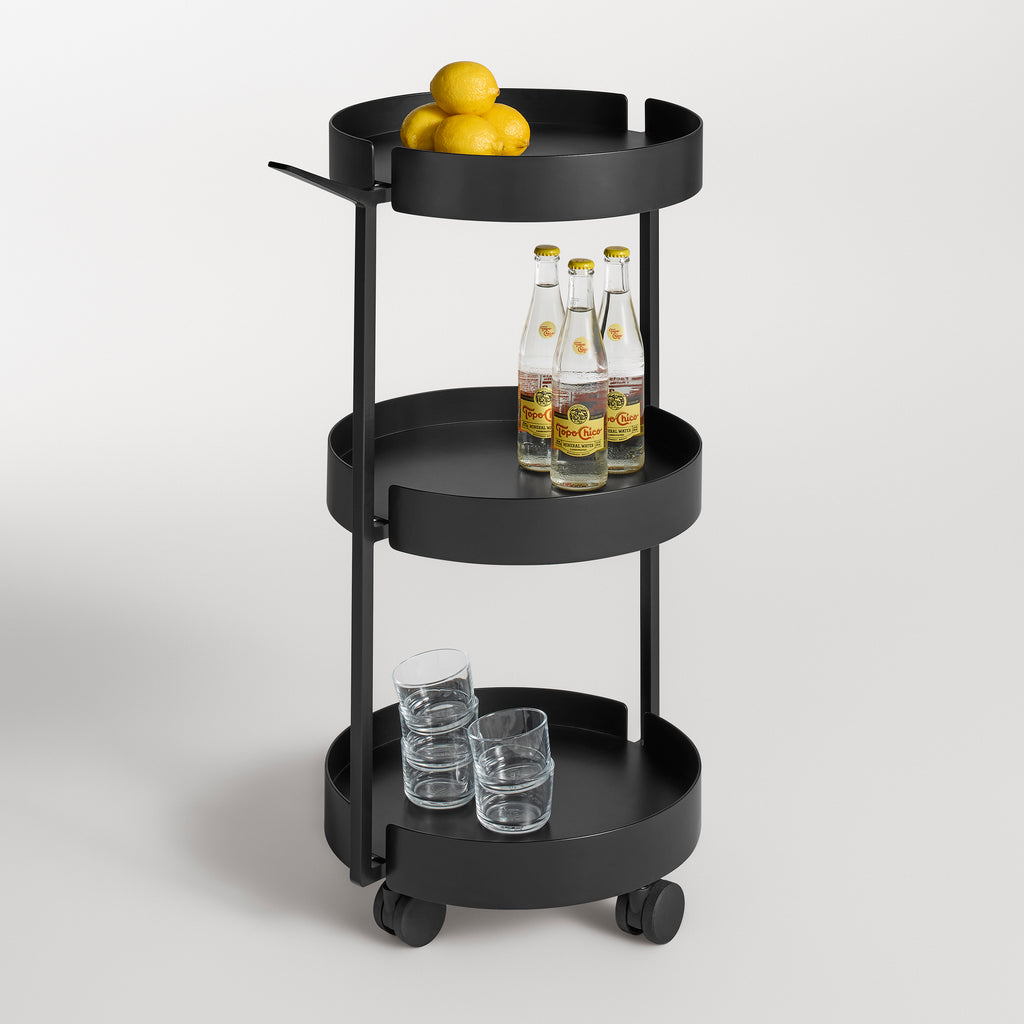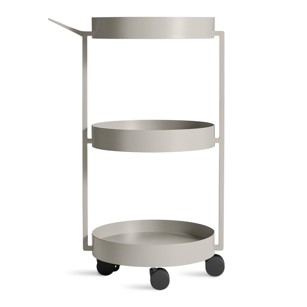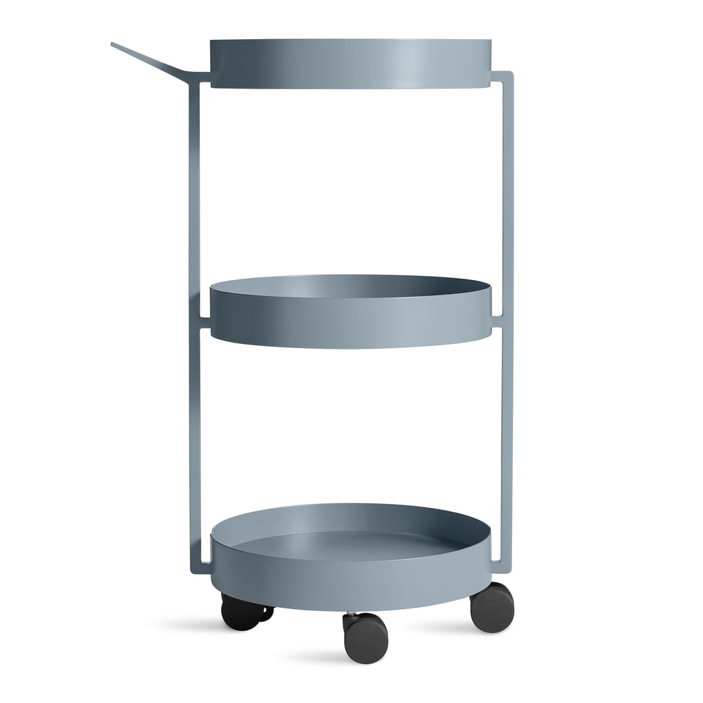 Roll with it. Tiered forms of powder-coated steel stack to become a robust and capable catch-all. Scoots’ pan-like handle offers the ideal push-and-pull grip, while smooth casters safely transport your belongings from point a to point b, c and d.