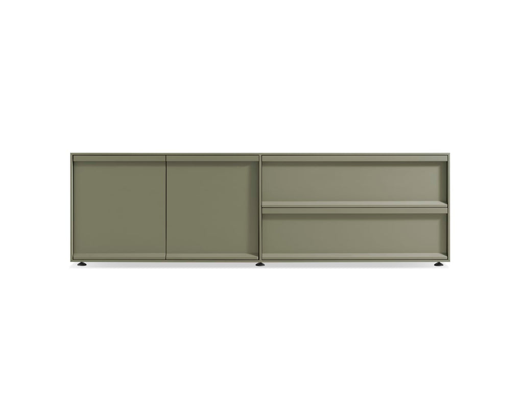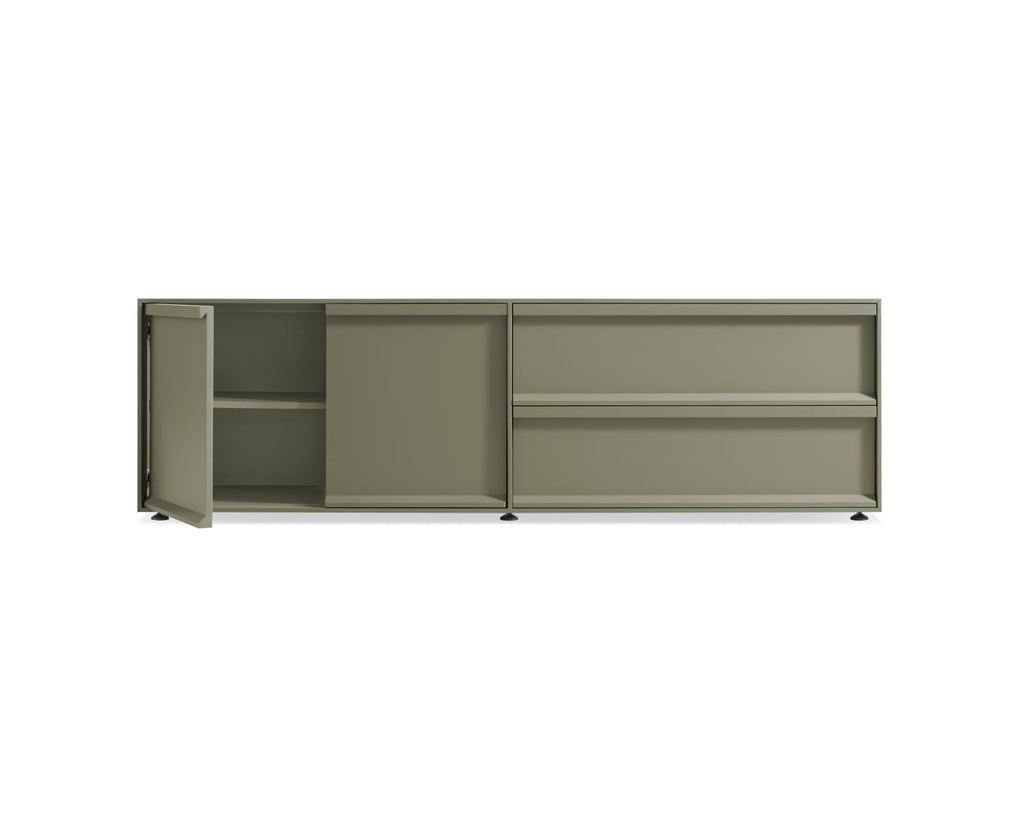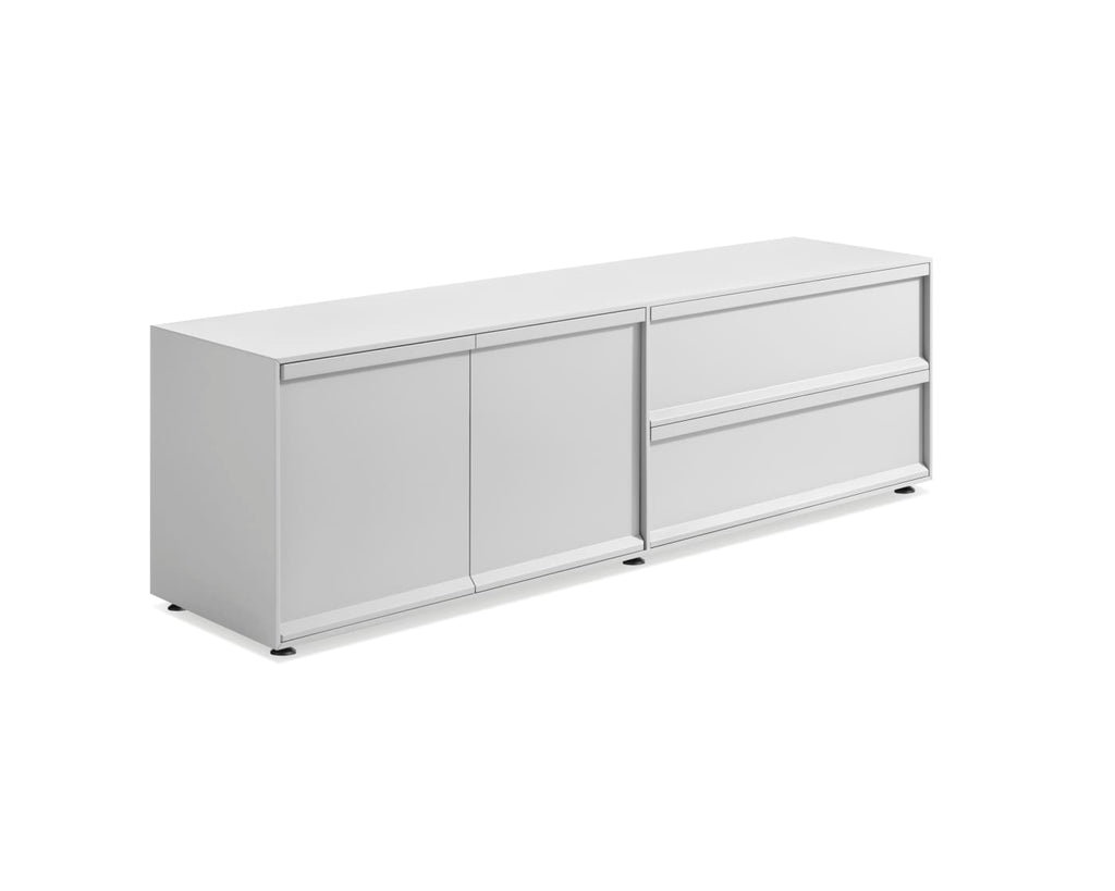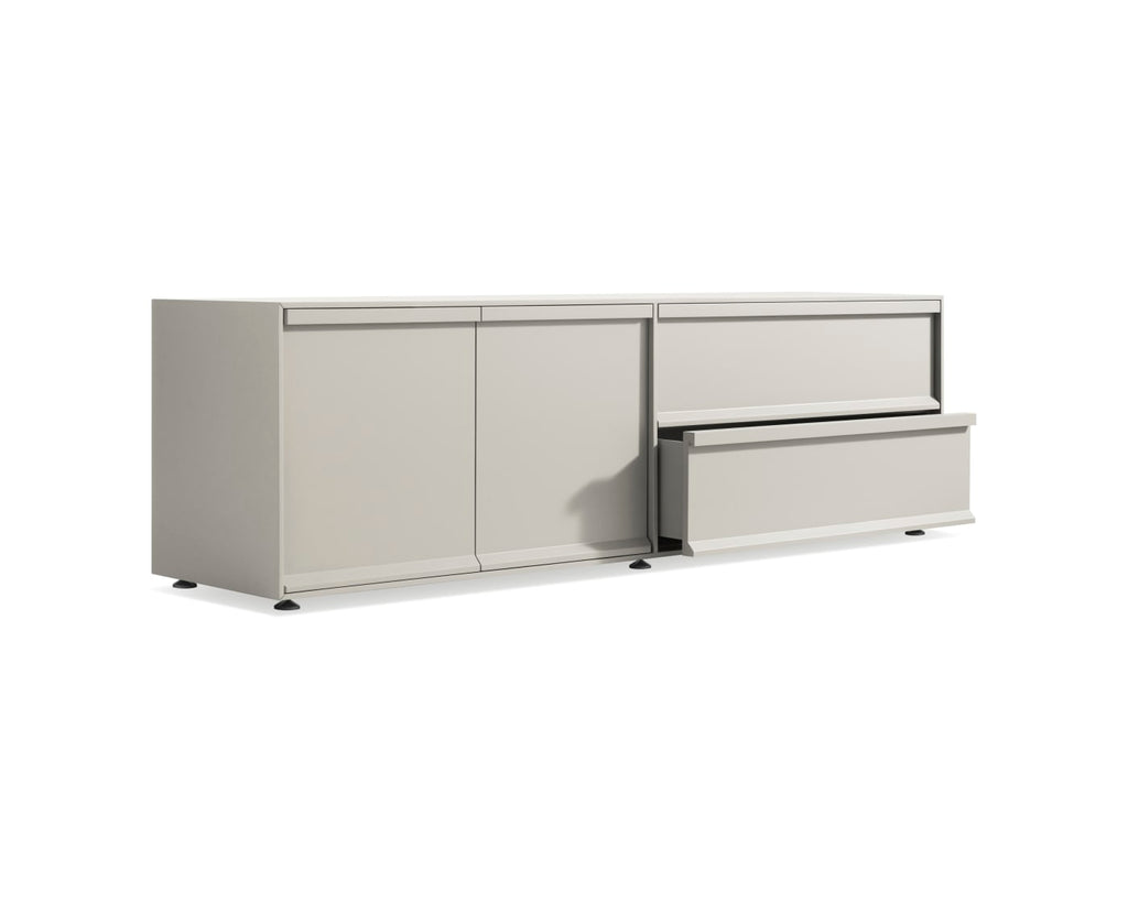 Tranquil staple. Crisp lines and unassuming relief pulls conspire to keep the action behind soft close drawers. A matte painted finish in muted tones delivers serenity and sets up a streamlined storage solution for the living room, bedroom and office.