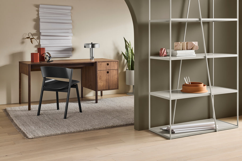 Warm wood pairs with slim dowel legs to create a sophisticated desk that’s up to any task. Two semi-cantilevered drawers keep office organization top priority. Round cutouts act as pulls and eliminate visual clutter while giving a nod to the leg shape.