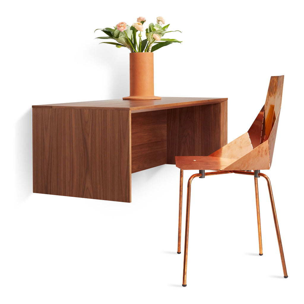 Wall-mounted desk makes the most of tight spaces and provides a custom-looking solution without the hassle of finding someone to build it. In walnut or white oak with flip up (secret) cord management compartment. Pair with companion cabinet and shelf units to create a full-on storage masterpiece.