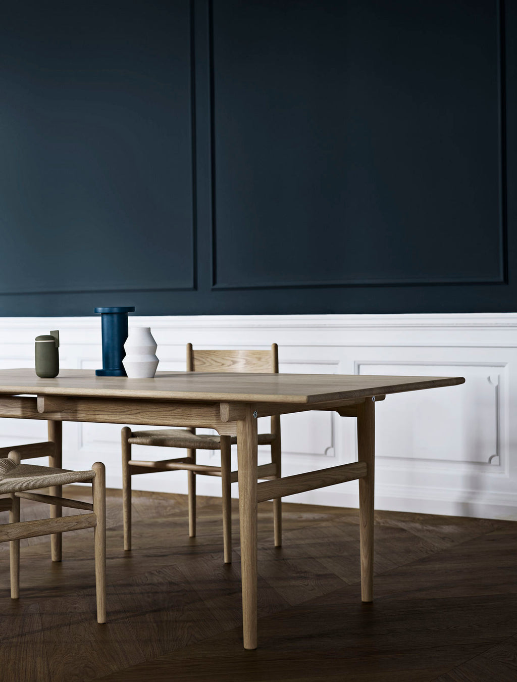 The tabletop appears to float above the frame thanks to its beautifully tapered edges, making the design appear extremely lightweight and appealing. An alluring dining table, the CH327 can also serve as a beautiful desk or conference table in any space.