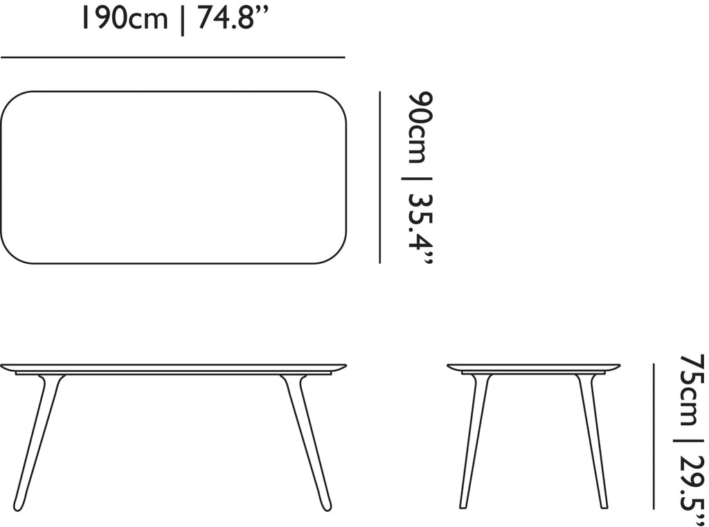 190: 74.8" wide by 35.4" deep by 29.5" tall