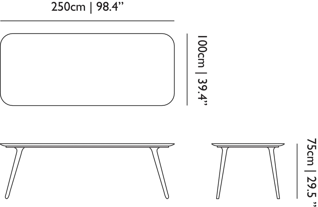 250: 98.4" wide by 39.4" deep by 29.5" tall
