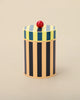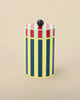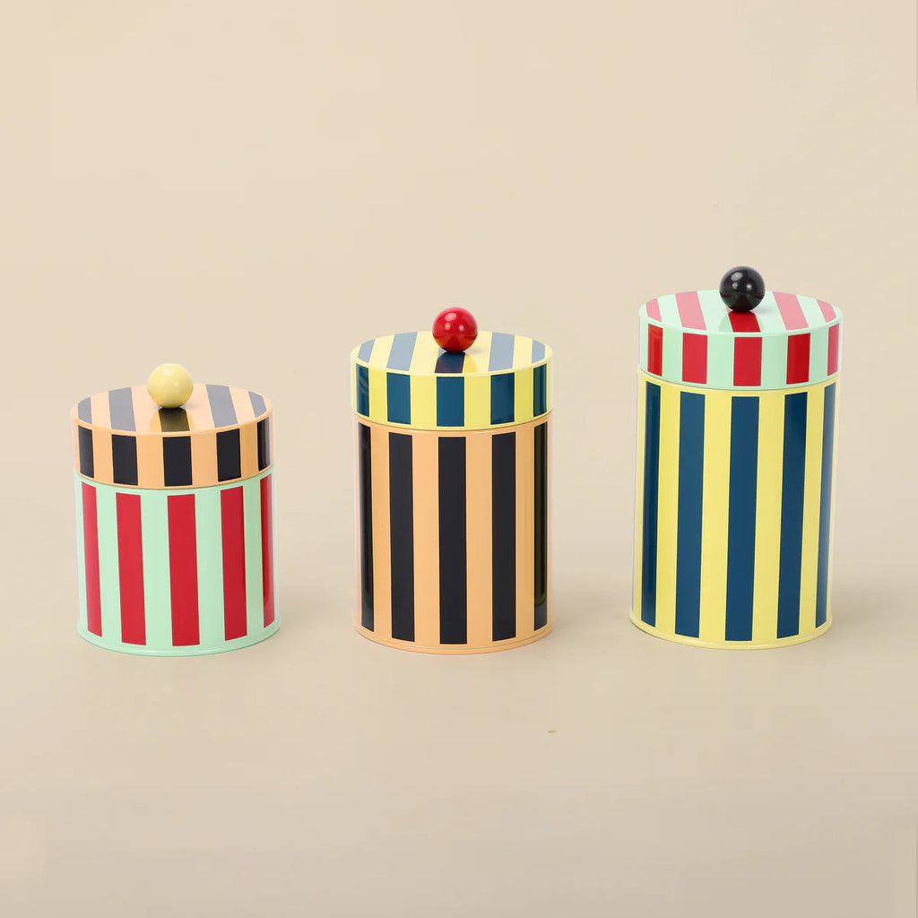 Powder-coated steel canisters with interchangeable lids and steel ball knob on top. Made in China.