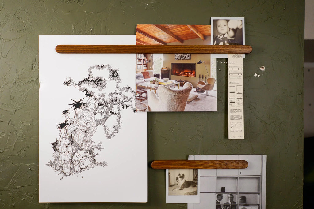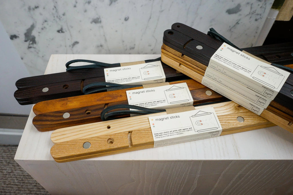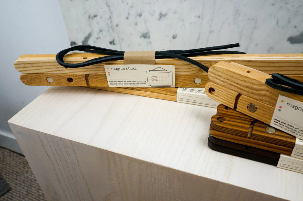 Hang your favourite prints or photos with with ease. Magnet Sticks magically stick together, clamping your paper goods between the front and back sticks. You can hang them with the included leather cord or use the screw holes and mount them for the ultimate display of clean, minimalist expression.