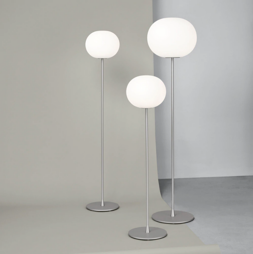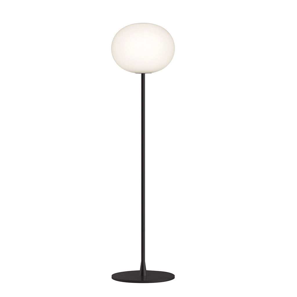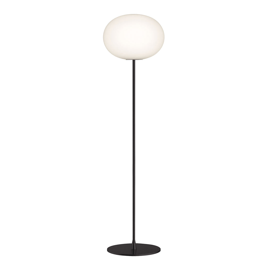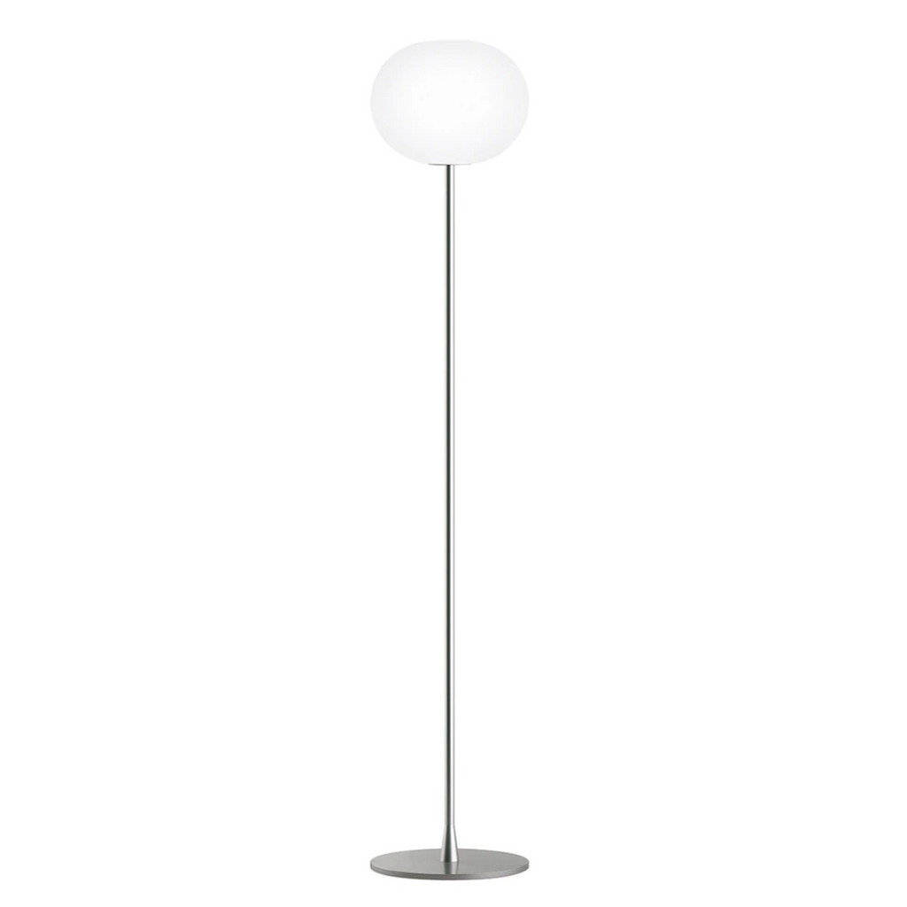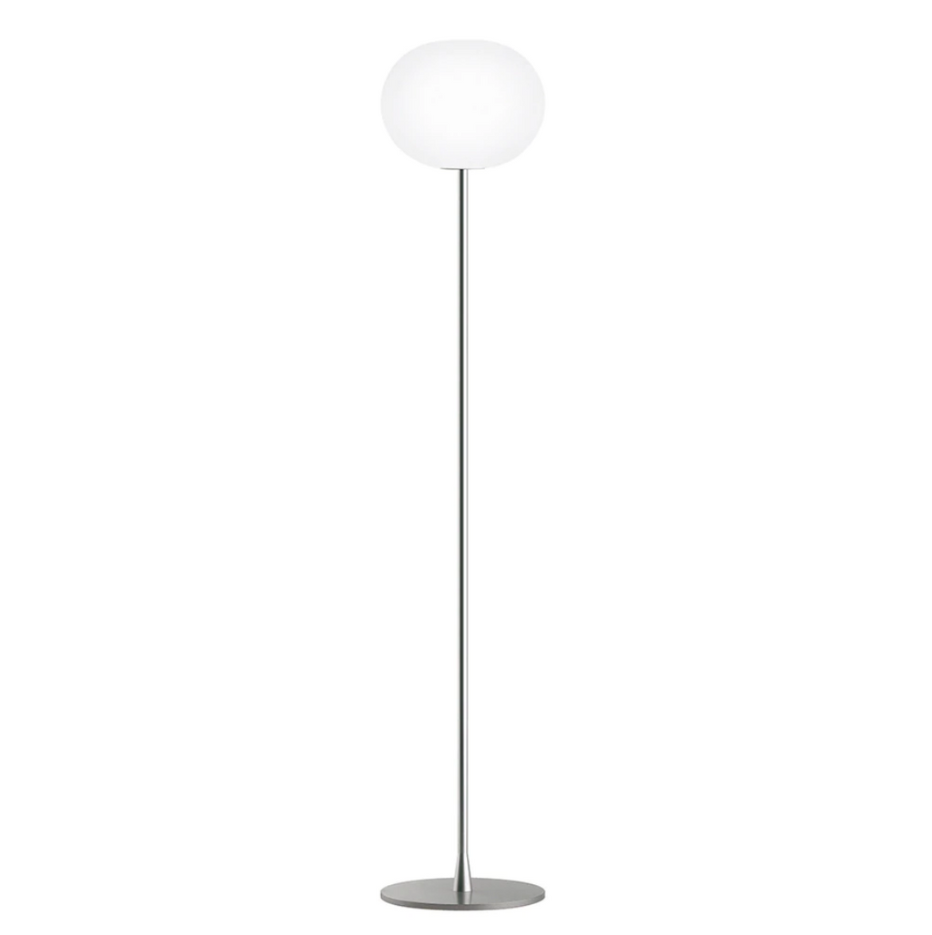 Part of the popular Glo Ball Series, the Glo Ball-F was created in 1998 by artist Jasper Morrison to invoke the radiant calm of a full moon. This contemporary floor lamp fits naturally into any design aesthetic, emitting a warm, diffused light that is ideal as a subtle up-lighter. It features a hand-blown, etched white opaline glass diffuser that is supported by a matte silver stem and base, or matte black.