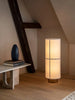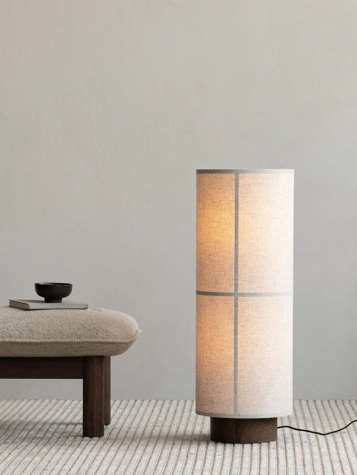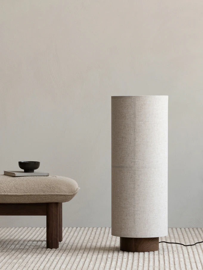 The cylindrical Hashira Floor Lamp rises majestically from the floor. The translucent fabric shade not only acts as a diffuser, projecting the light in multiple directions while creating a cozy, glare-free ambiance, it also adds palpable appeal that enhances the softness of an interior – acoustically as well as tactilely.