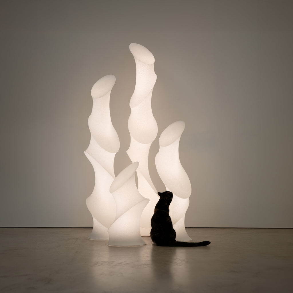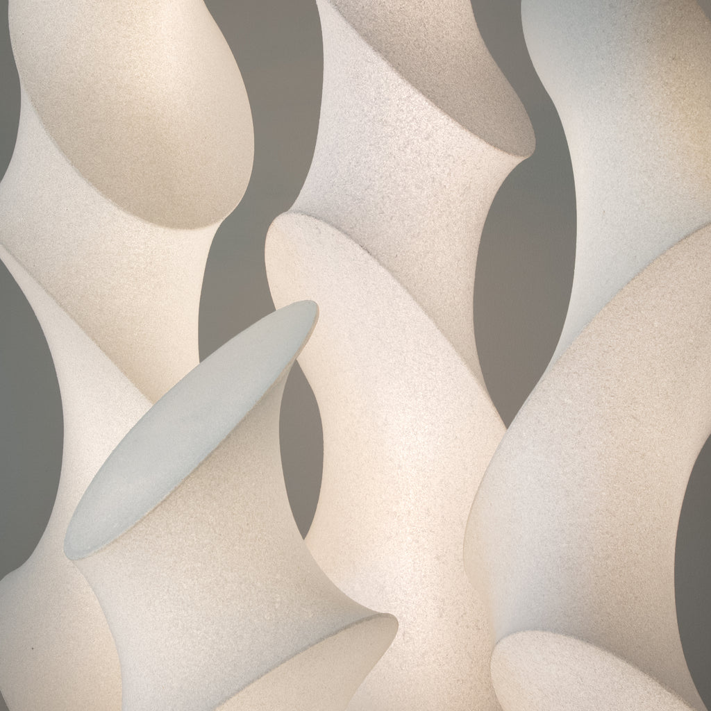 A curious object with luminosity and poise, Minima is a floor or table lamp designed to softly illuminate any indoor space. The name Minima tells the story of its surface; it’s elegant form represents the minimum 3D surface between 2D curves. The skin of the lamp is a proprietary paper pulp composite surface. The subtle tone of illumination, unique to Minima, results from graded filtration through the composite skin.