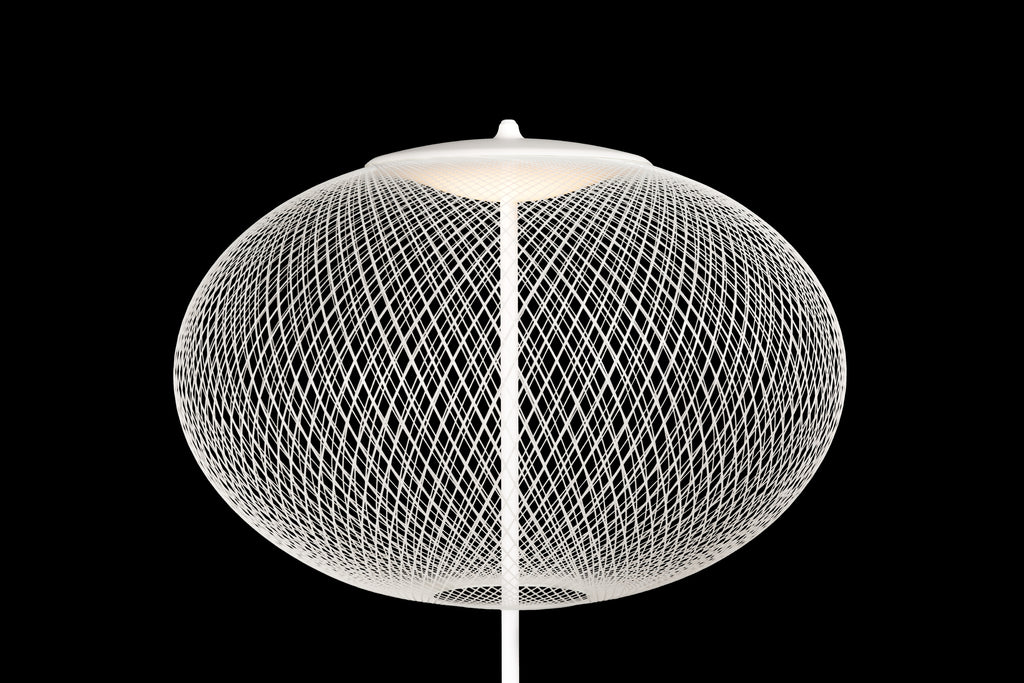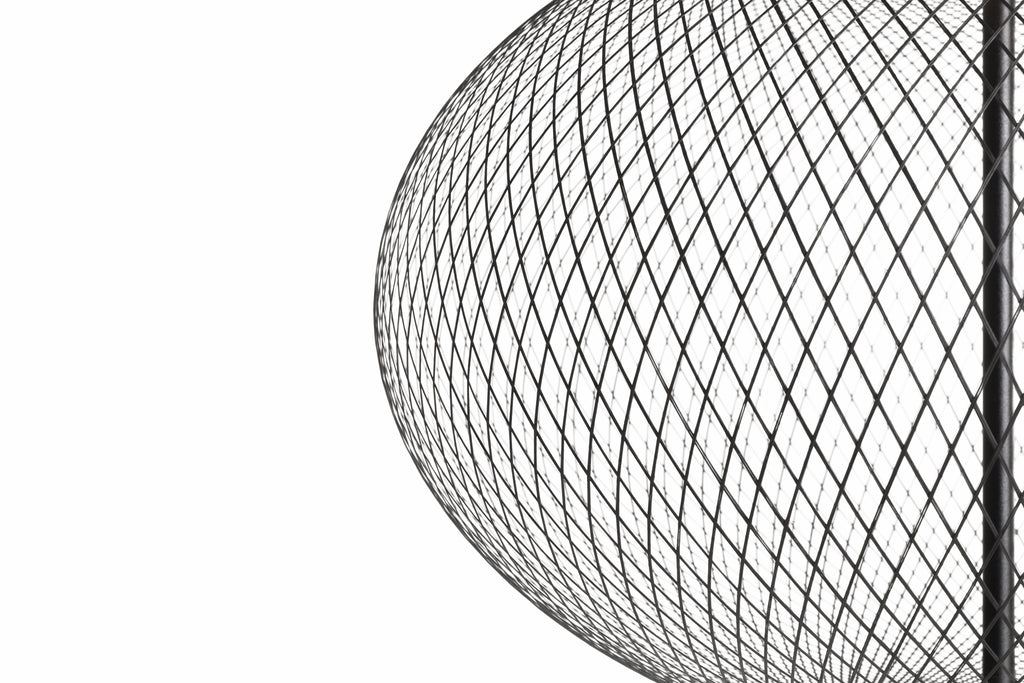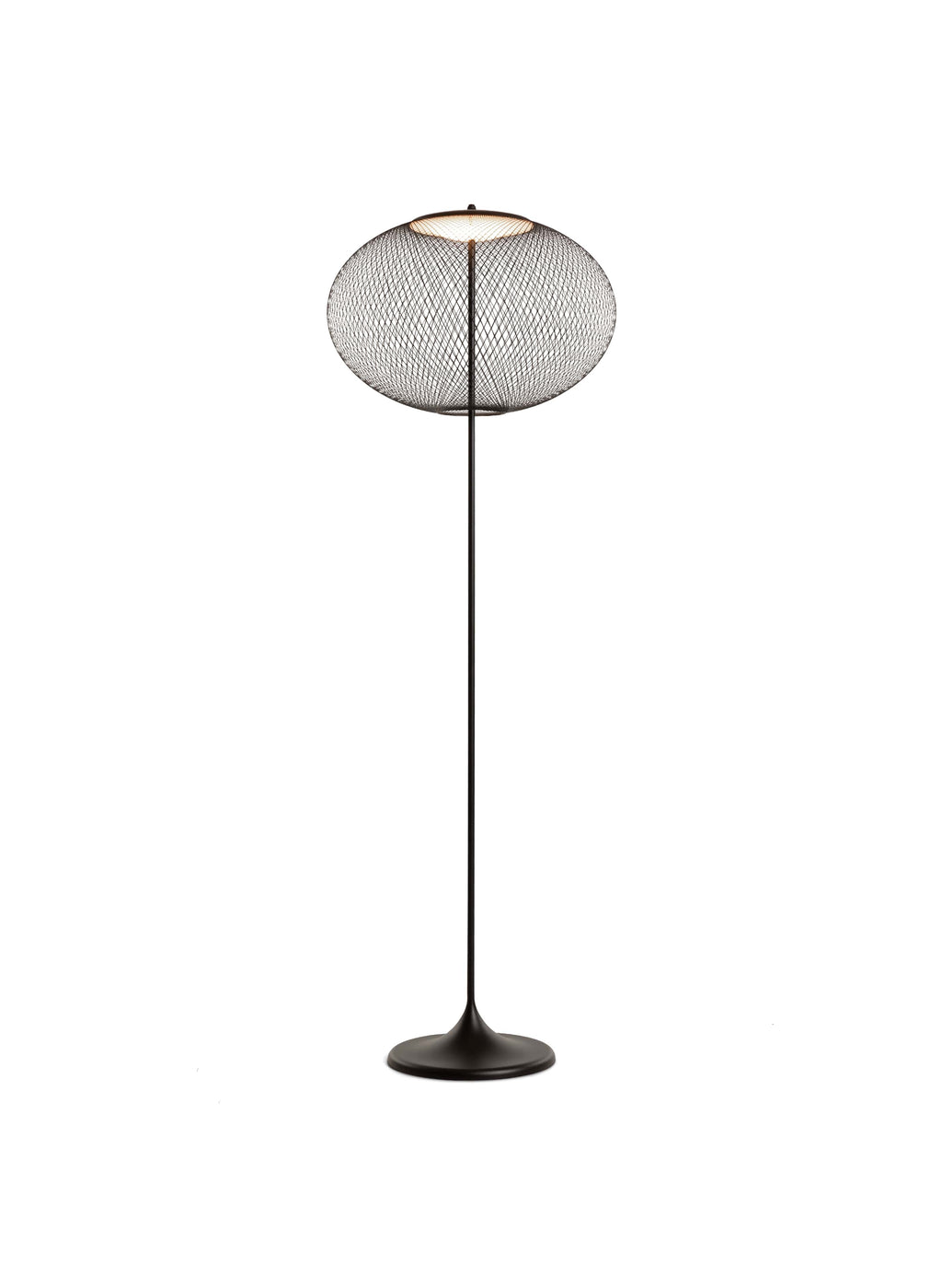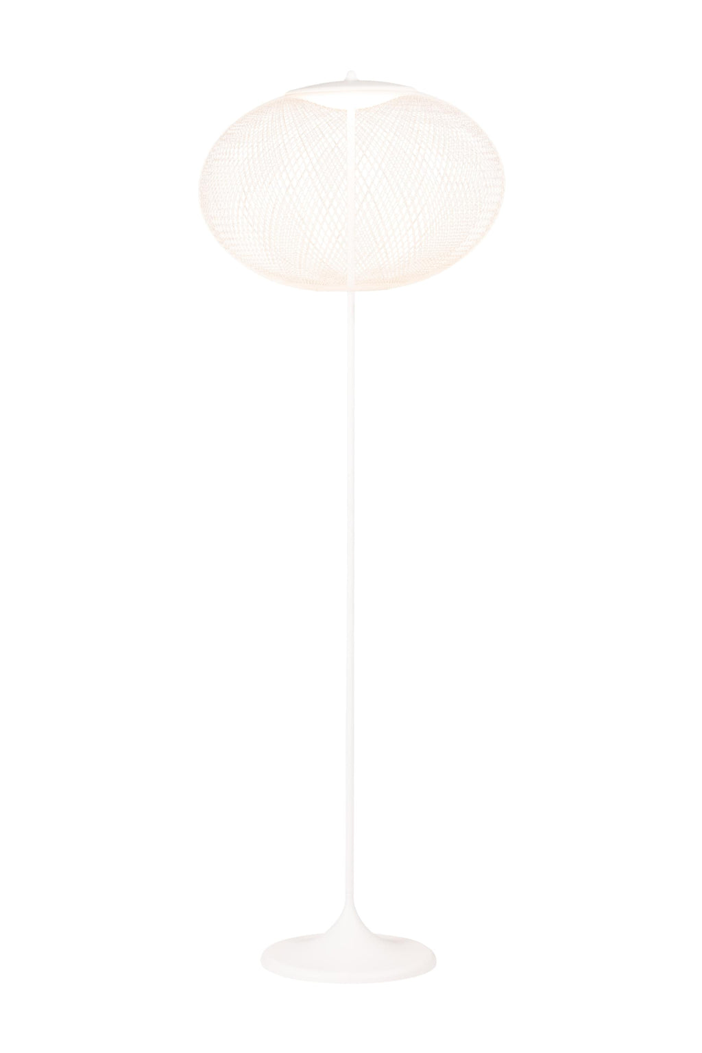 Like its suspended family members, the NR2 Floor Lamp, by Bertjan Pot, sports an elegant and bright oval-shaped bubble of white or black thread. Thanks to the airy lattice pattern of the bubble and the sleek steel column, the NR2 Floor Lamp doesn’t block any views. Put this versatile design in any place that needs brightening up, such as a dark hallway or next to your favourite reading spot. The integrated LED lamp in NR2 subtly diffuses a soft and magical glow. NR2 Floor Lamp is available in two different colours.