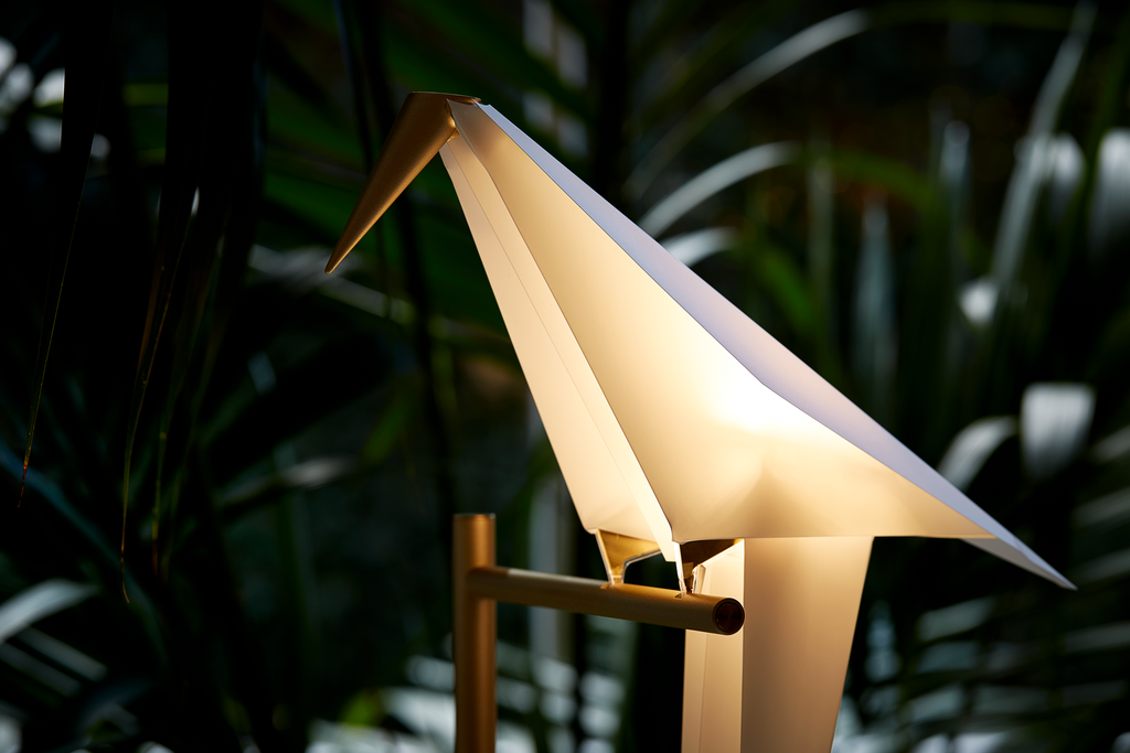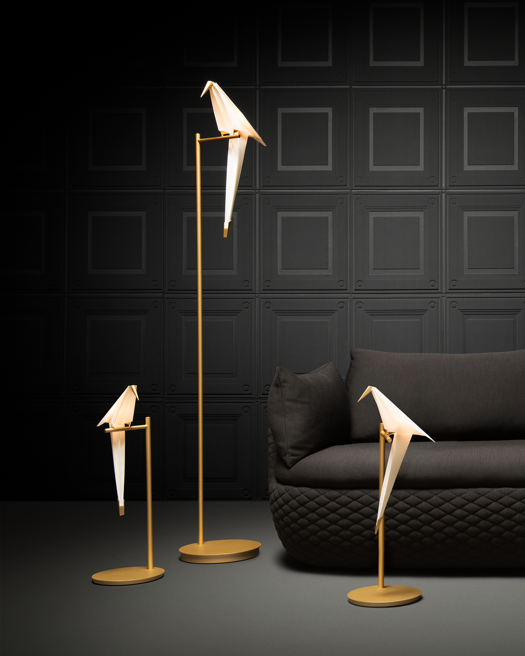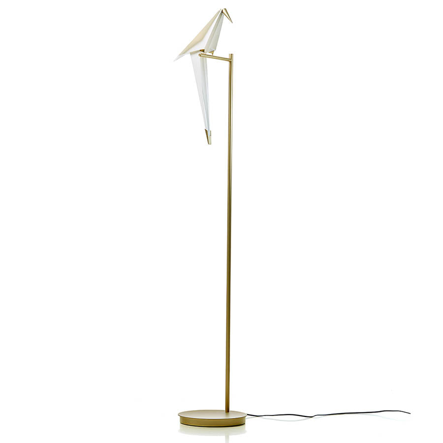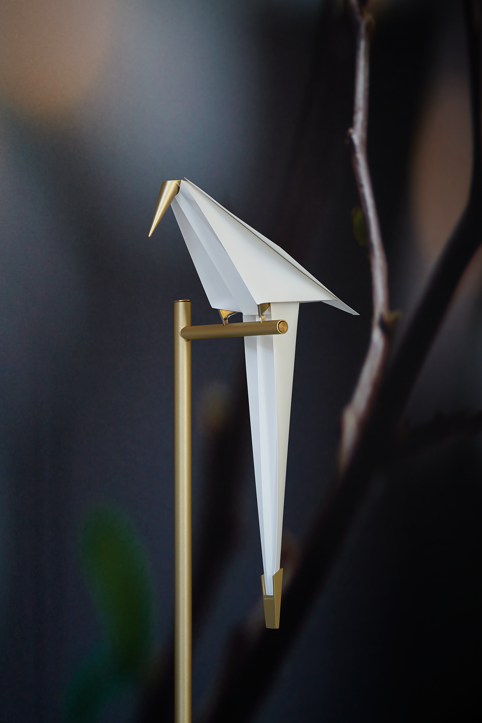 Look up, into the soft light, follow the fluttering sound and sparks of movement. A bird is gracefully balanced on a tall metal perch, beautiful and proud, a swinging glimmer of warm light... yet you are inside, after daylight has faded, under the spell of the Perch Light Floor Lamp!