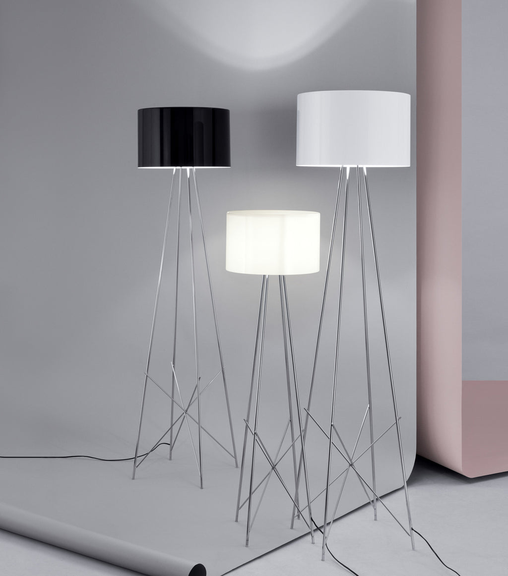 The Ray F is available in two models with diffusers available in black or white aluminum, or grey glass. It emits a gorgeous, diffused light. With the black and white finish, diffusers are lathe-shaped aluminum and painted white on the inside.