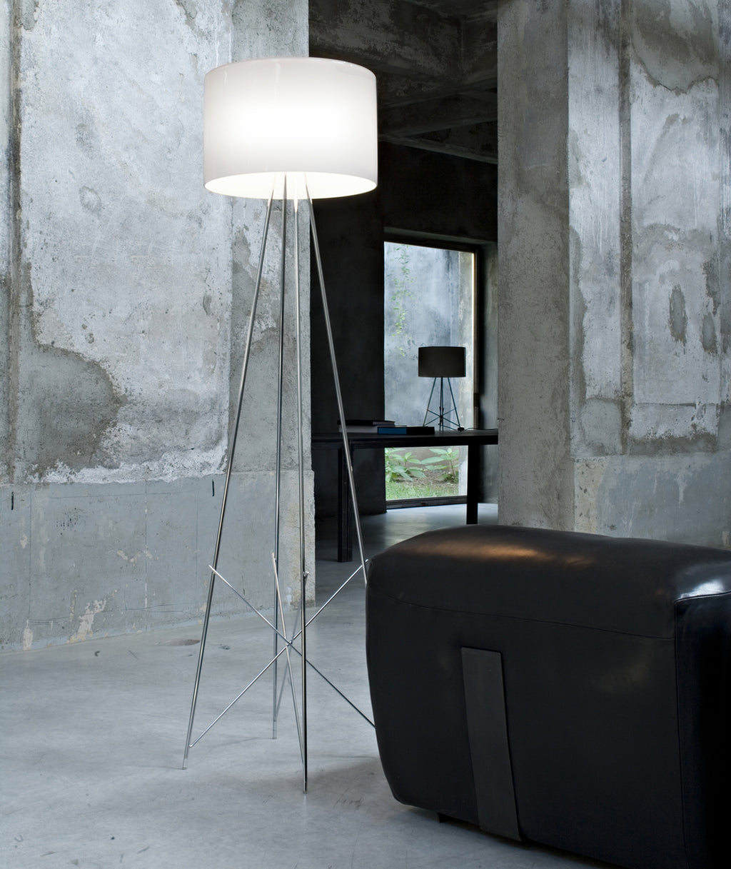 Designed by Rodolfo Dordoni in 2006, the Ray F floor lamp updates a classic shape to give it a decidedly contemporary edge. The steel tube structure of this modern floor lamp is welded, brushed, and chrome-plated, and its diffuser support disk is die-cast, polished, and chrome-plated with Zamak alloy. The lamp has a resistive dimmer wired on the cord, offering a 0-100% lighting adjustment. The power cord is a black PVC/PVC (flat) sheath.