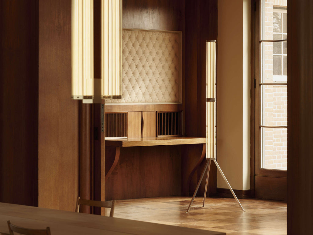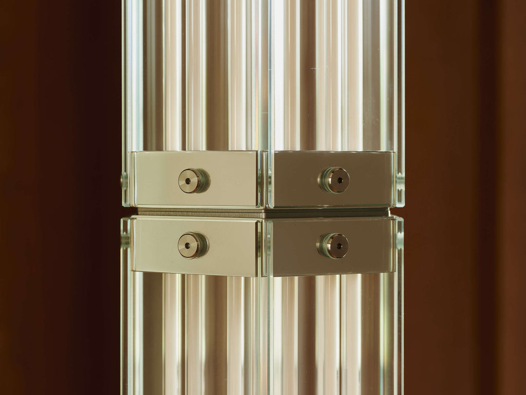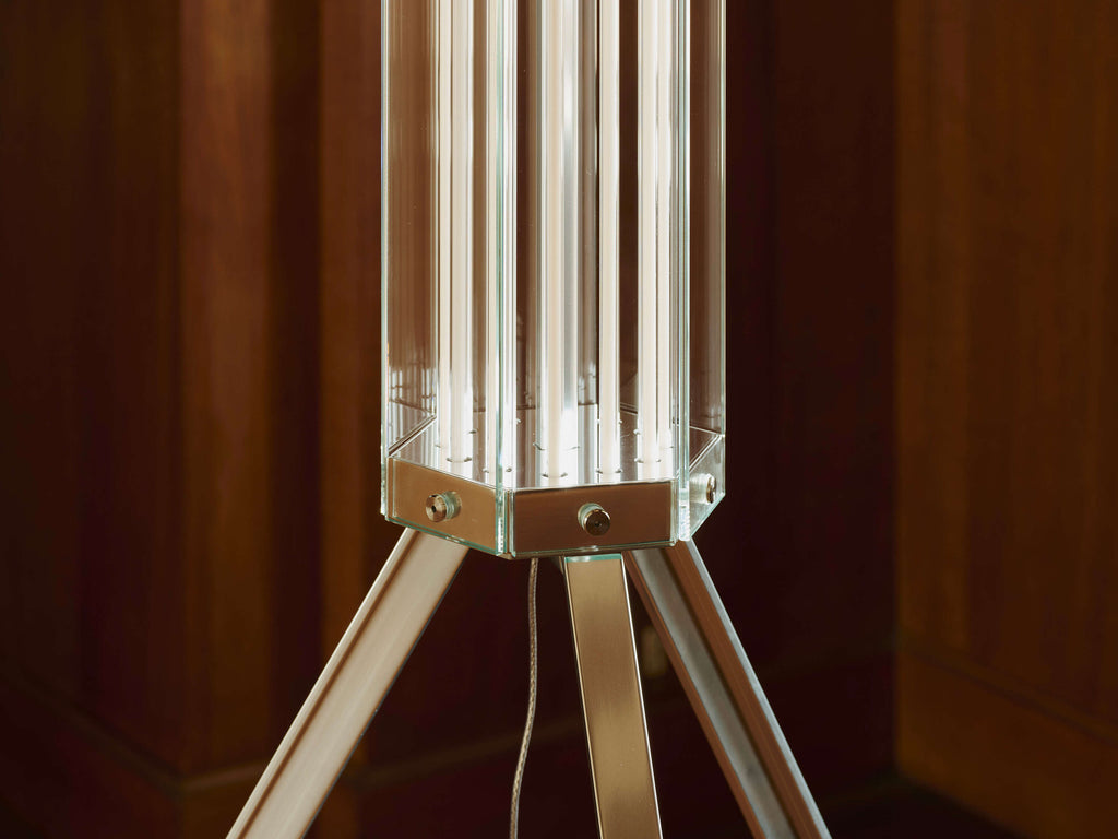 SuperWire is the first family of modular lamps designed by Formafantasma for Flos. A magical and poetic project, with an essential design but a great stage presence, which recalls the work of the great glass masters of the last century. Made of planar glass and polished aluminum, its design originated from the development of a custom-made light source that emits a warm and homogeneous light.Made up of one or more hexagons of planar glass connected by a polished aluminum element, SuperWire lights up its entire surface thanks to a new source: a very thin, flat, soft, flexible LED strip measuring up to one meter, which emits a warm and homogeneous light along its entire length and which can be easily removed for replacement and repair, unique in the panorama of LED bulb-less lamps.This floor version, is built with two 75 cm high modules, placed one above the other, resting on a steel tripod, a tribute to the historic Luminator by the Castiglioni brothers.