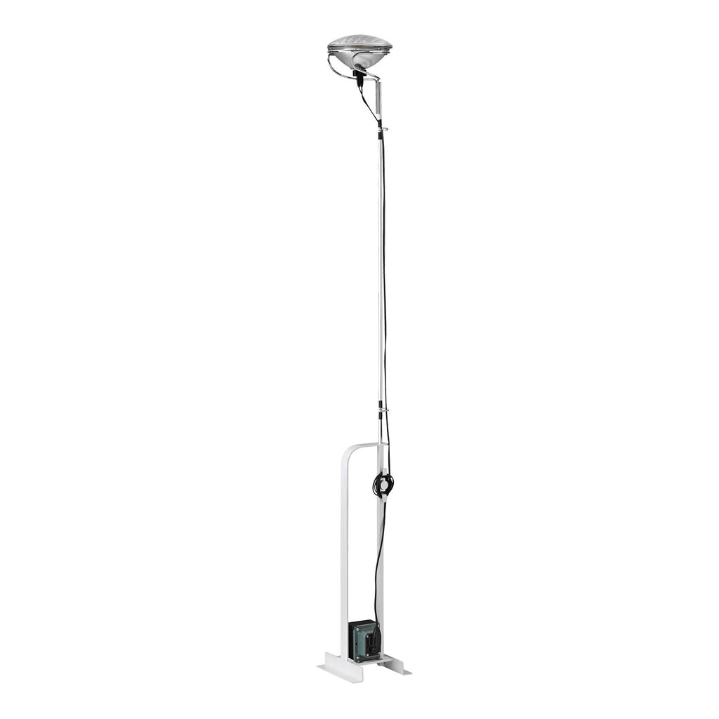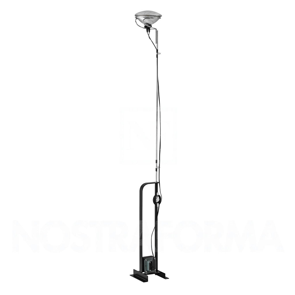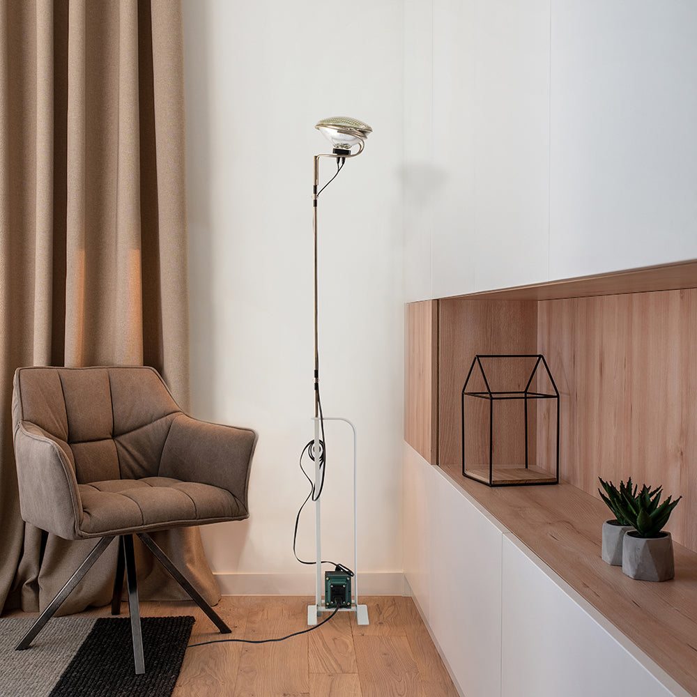 The Toio floor lamp has an enamel steel base that supports a hexagon shaped, nickel-plated brass stem. Along the stem are fishing rod rings used to guide the electrical cord from the bulb to the transformer. A cleat on the base, like that found on a boat or ship, serves as a functional element designed to keep the cord neatly coiled in when the lamp is adjusted to a lower height.