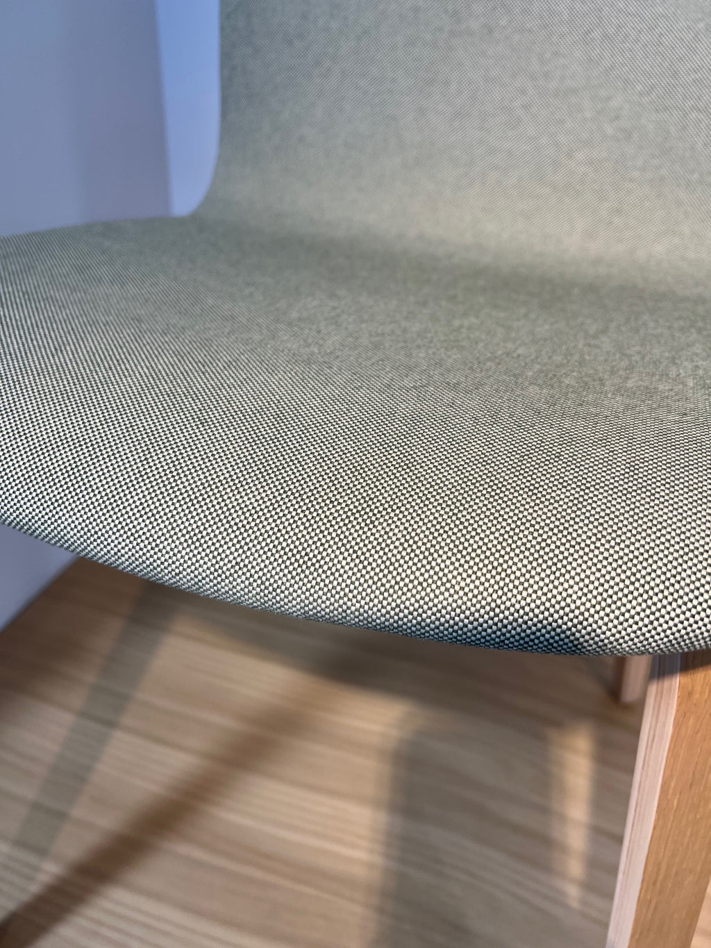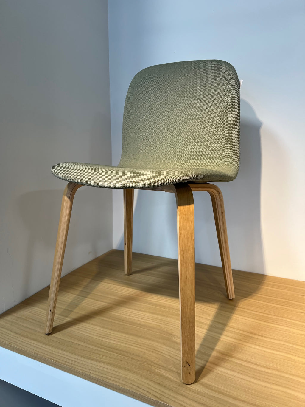 Upholstered version: Shell is made in form-pressed veneer with foam and fully upholstered with textile or leather. Wood Base is form-pressed in veneer with a water-based lacquer.