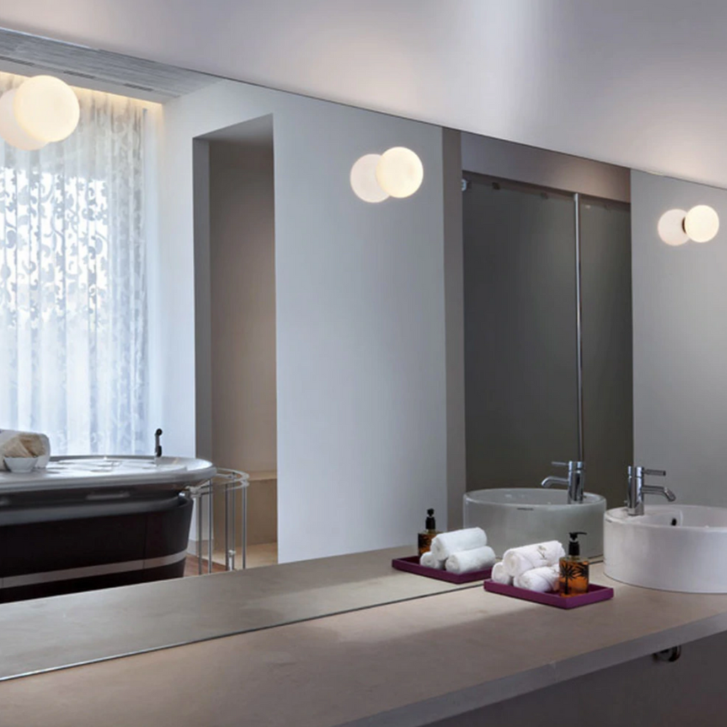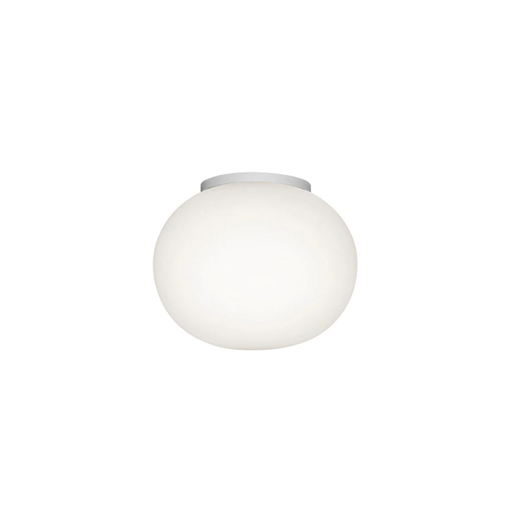 Part of the popular Glo Ball Series, the Glo Ball C/W Zero was created in 2009 by artist Jasper Morrison. Its shape invokes the radiant calm of a full moon. This contemporary wall lamp fits has a diffuser made of externally acid-etched, hand-blown, flashed opaline glass and a die-cast aluminum threaded ring nut with alodine plating finish.