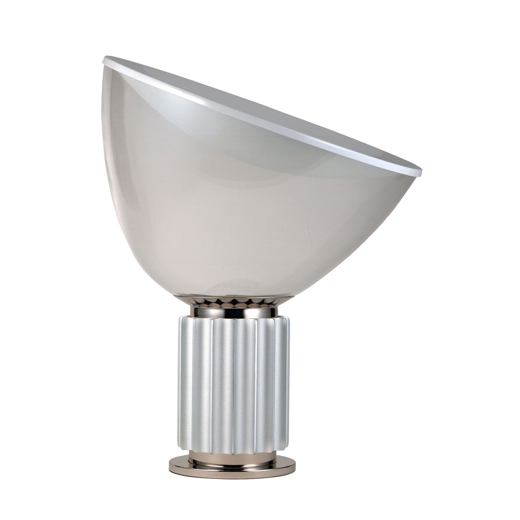 The TACCIA was designed by Achille and Pier Giacomo Castiglioni in 1962. The TACCIA table lamp has a concave spun aluminum reflector with a matte white finish. The light can be adjusted by positioning the blown glass or PMMA diffuser as required. This TACCIA emits reflected light. This modern table lamp is available in black, anodized aluminum and anodized bronze.