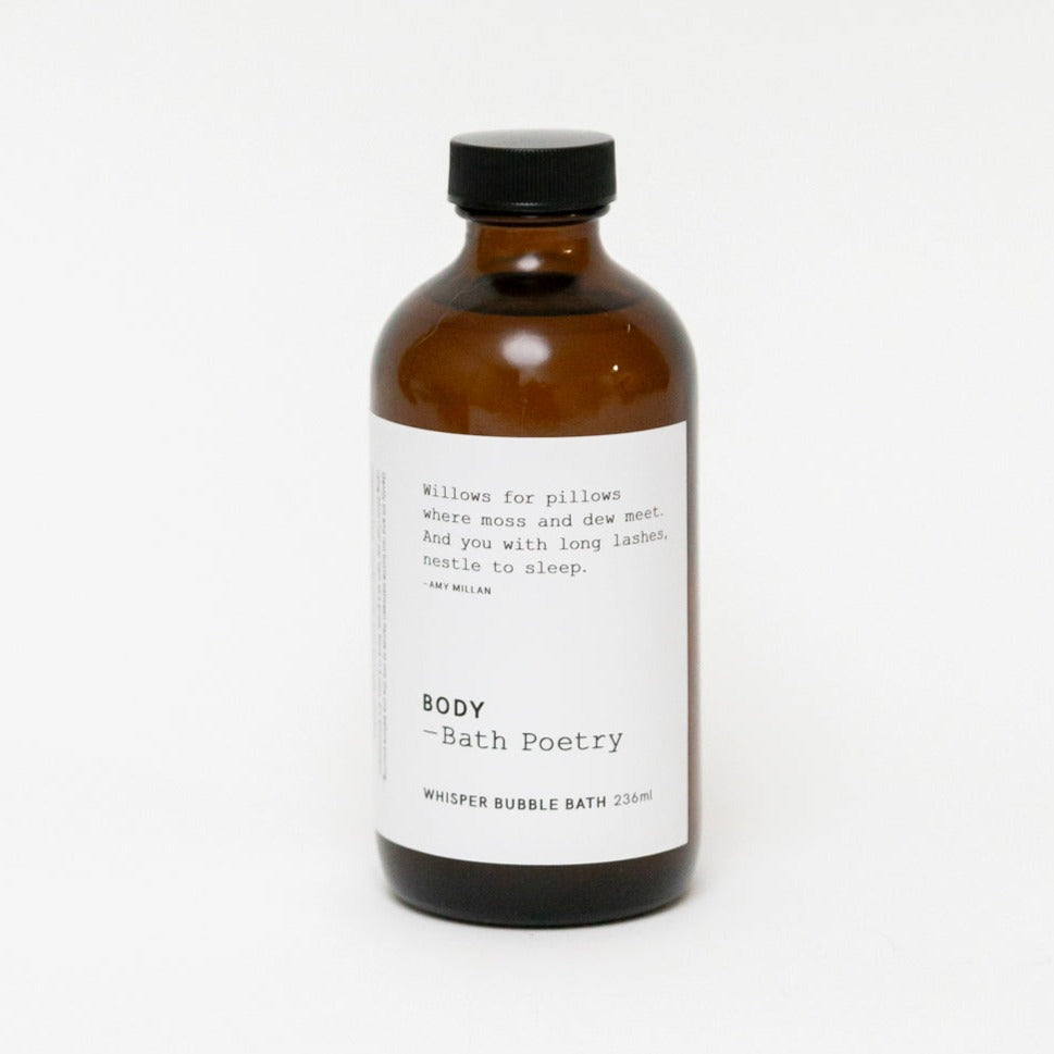 Bath Poetry has collaborated with Canadian singer/songwriter/poet Amy Millan (Stars, Broken Social Scene) to offer an all-natural, softening bubble bath. Each bottle includes an original poem written by Amy, especially inspired by the experience of bathing in luxurious bubbles. One ounce of this product and your tub is filled with soft and calming bubbles, using only plan-based ingredients, no sulphates or parabens.