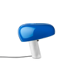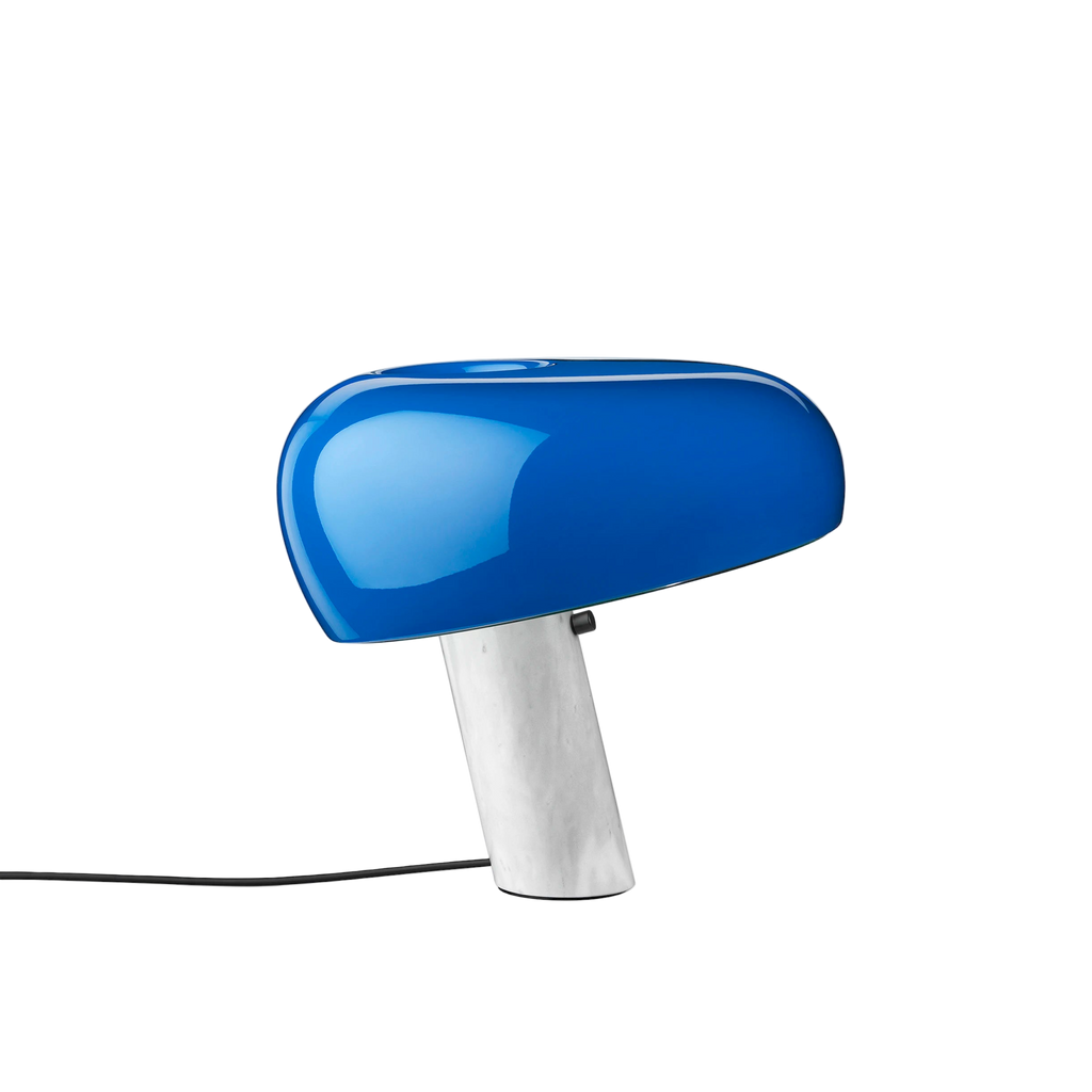 The Snoopy provides direct light through a thick glass disk and an enamelled reflector, both resting in perfect balance on a white marble base. There is an internal dimmer and switch.