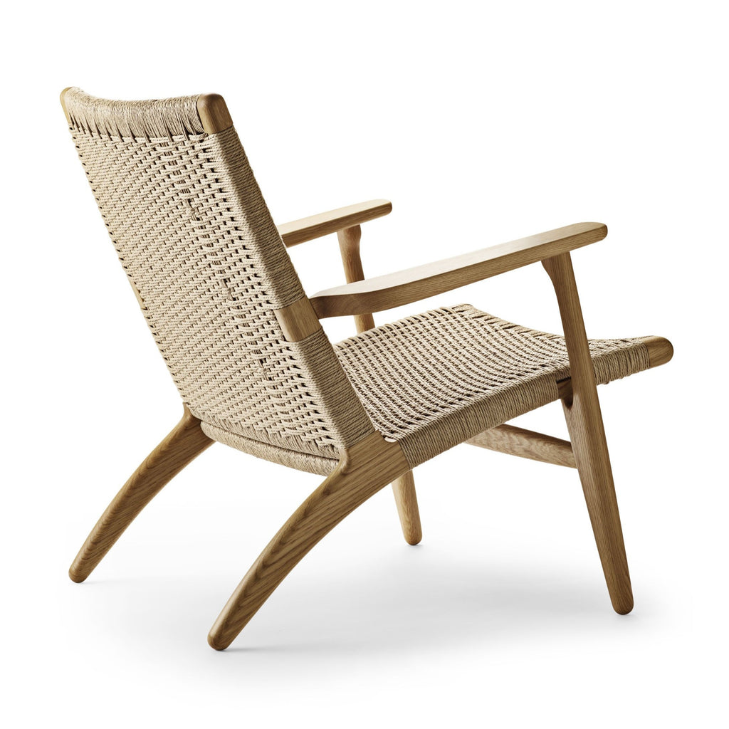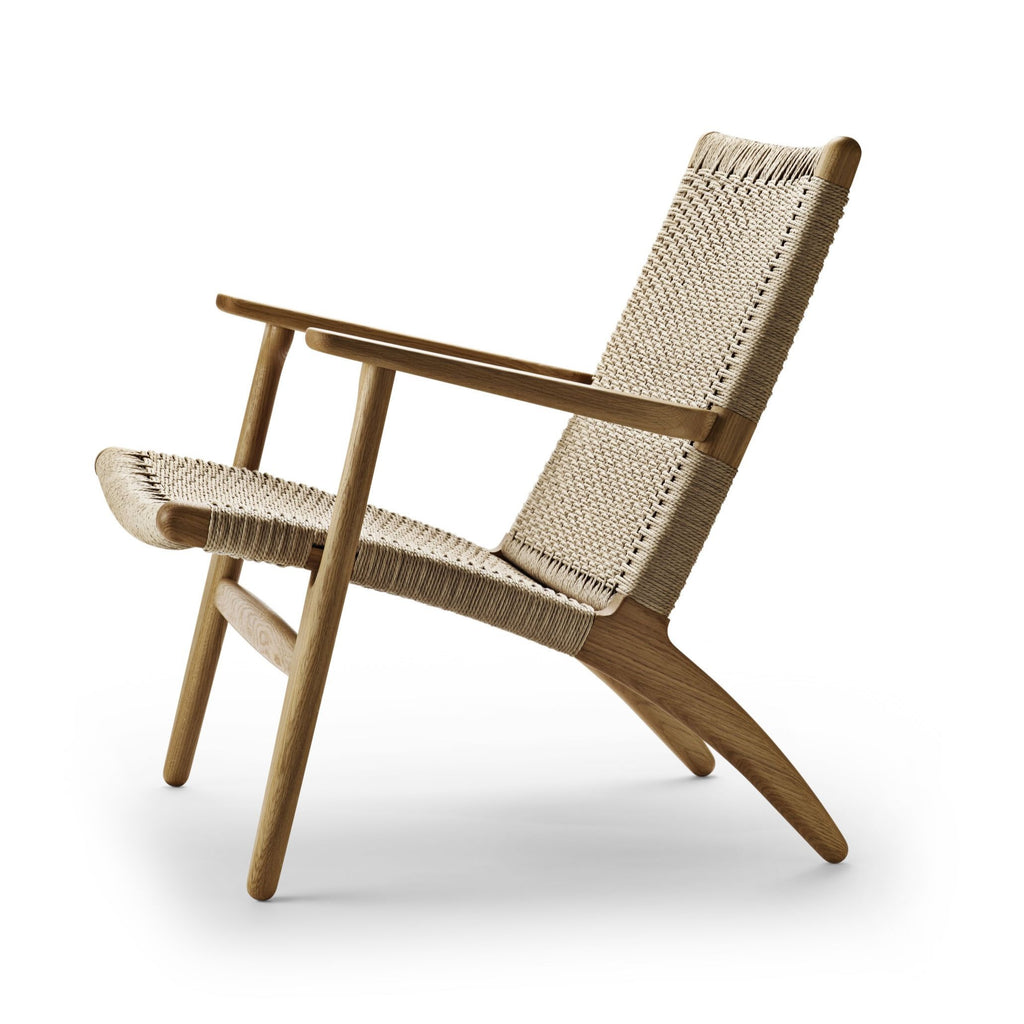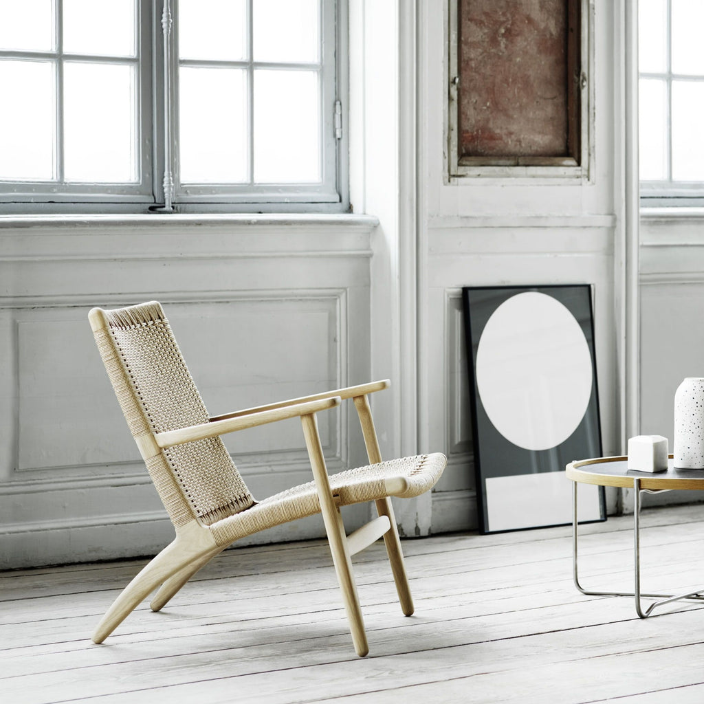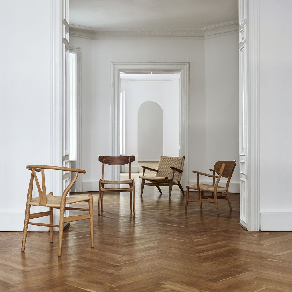The CH25 lounge chair, like many of Hans J. Wegner’s other iconic designs, is clean and simple in its distinctive shape. But its introduction caused a stir due to Wegner’s choice of materials on the backrest and seat. The woven paper cord, a replacement for seagrass developed during World War II, had not been used in furniture before. However, Wegner was enthusiastic about the look of the material and its non-stretching and optimal durability, and so were generations after him.