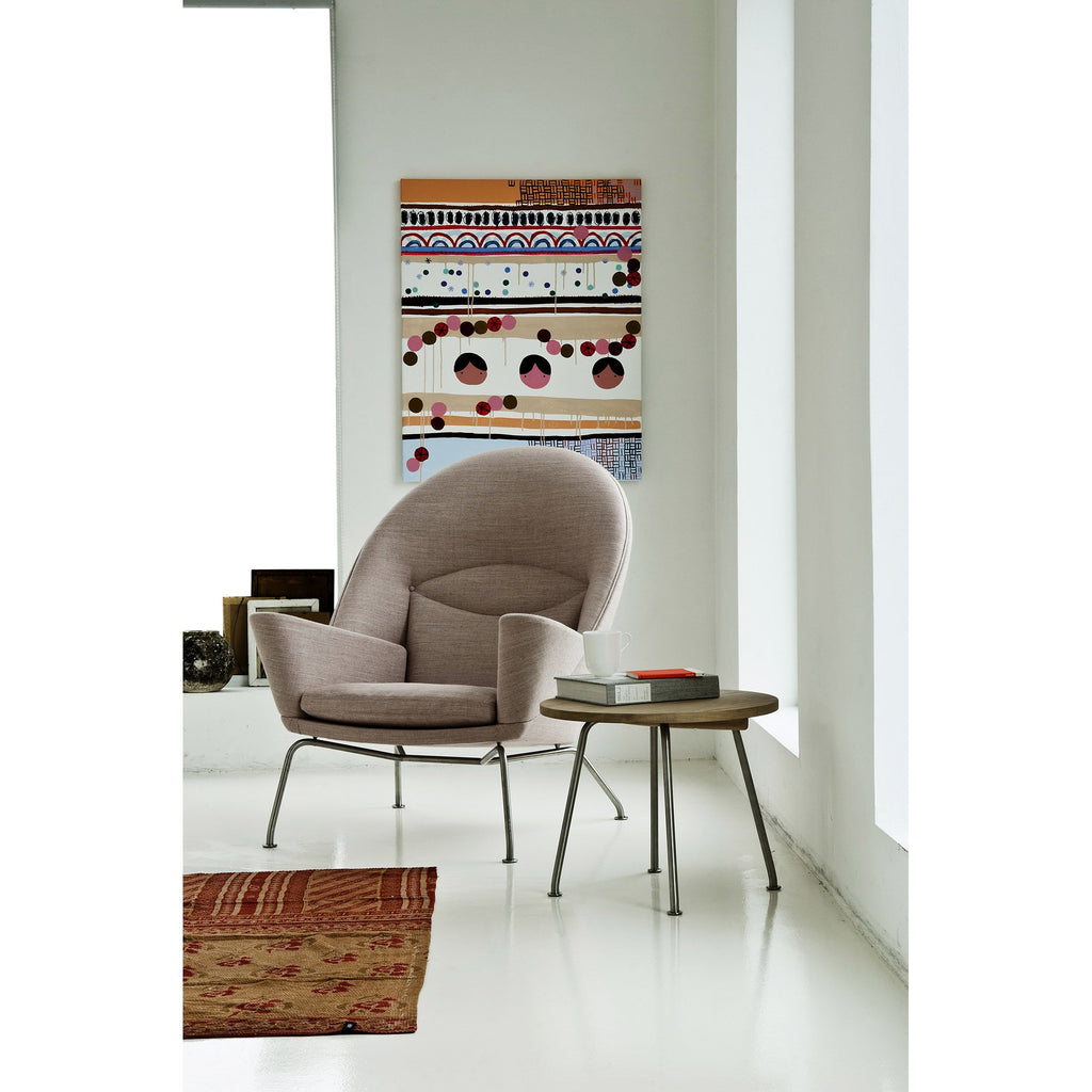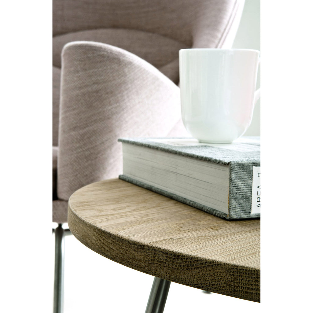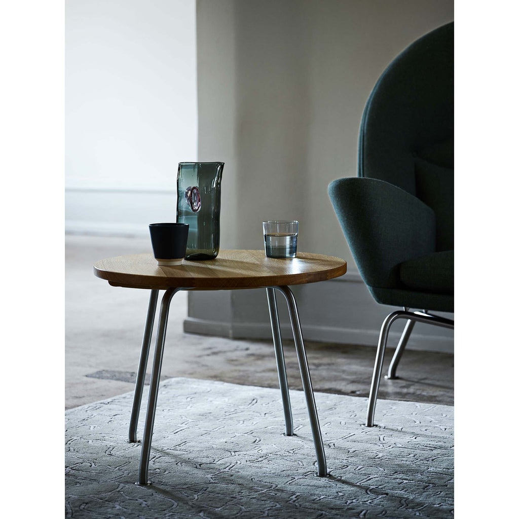 CH415 can easily be moved around and used as a coffee table, as a side table as well as an extra seat. The table, with its specially shaped steel frame, fits particularly well with Wegner’s upholstered lounge chairs with similar legs.