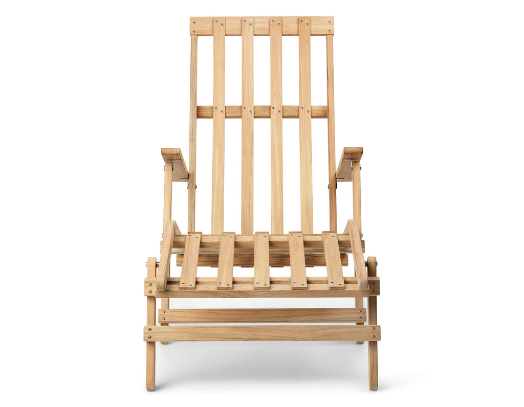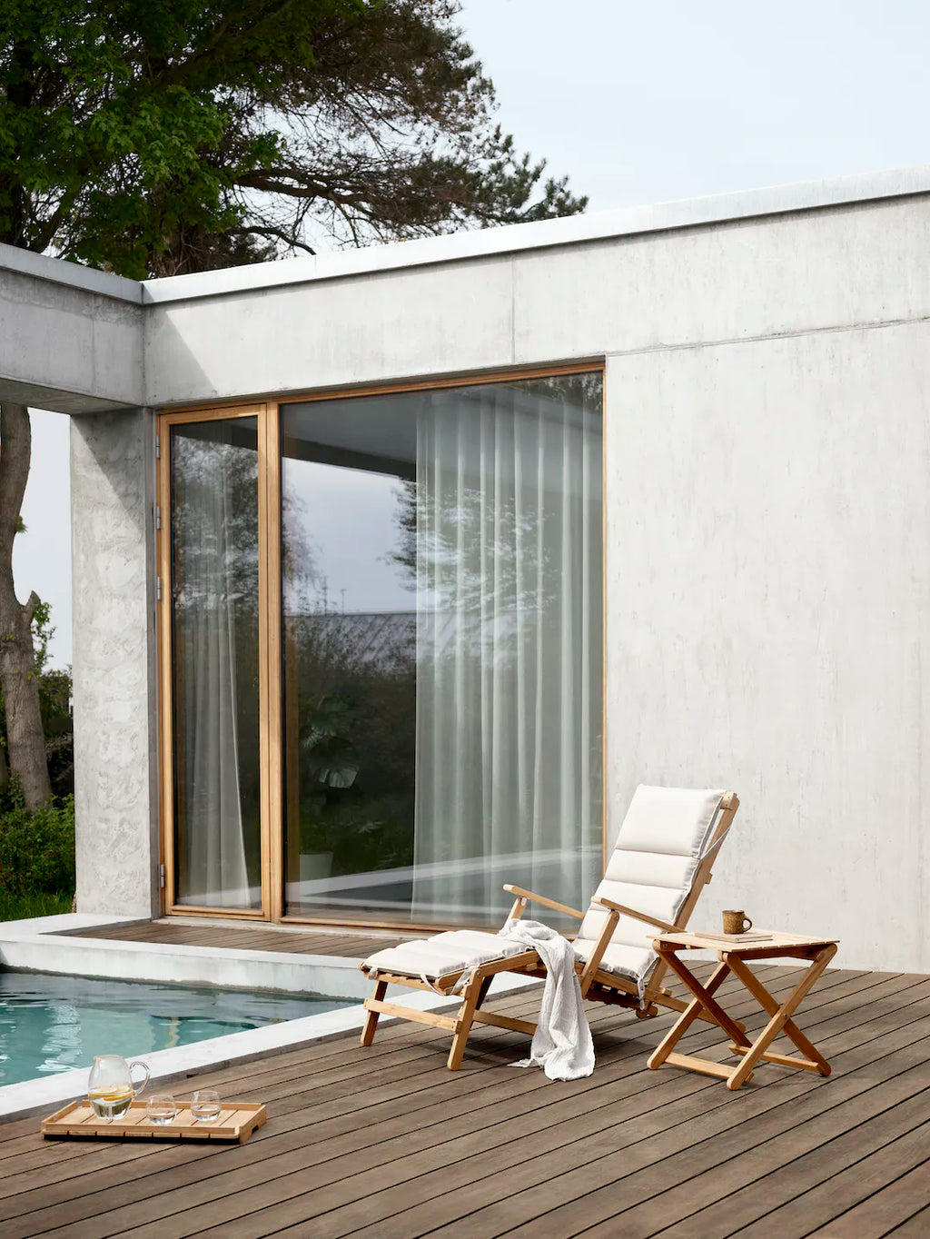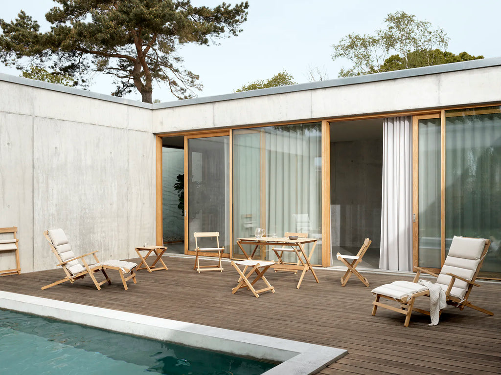Børge Mogensen, known as ‘the people’s designer’ for his enduring, high-quality furniture that focused on user needs, originally developed the Deck Chair series for his own balcony in the late 1960s. Lacking in outdoor furniture that was comfortable, functional and space-saving, he created foldable designs that could hang on a wall when not in use.